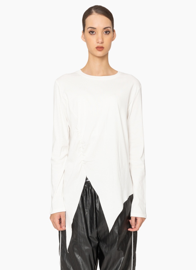 Introducing the L35013 Oren Top from Bone and Arrow. This modern wardrobe staple presents a sculptural take on the classic long-sleeve, perfect for elevated everyday dressing.