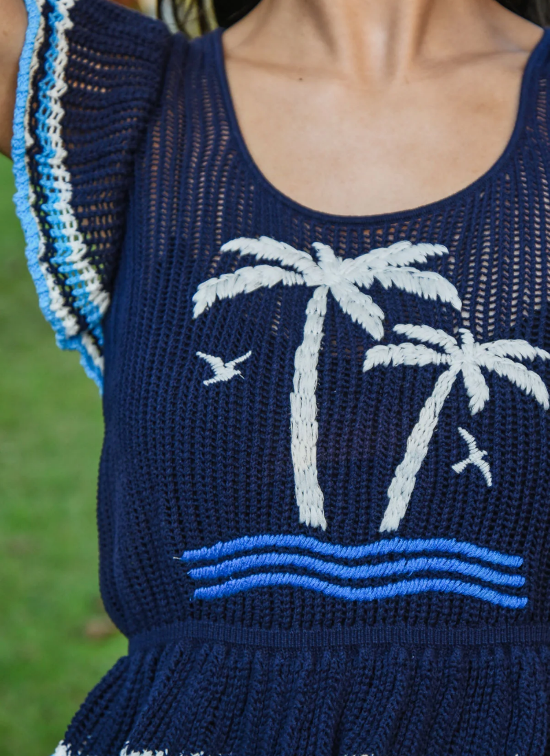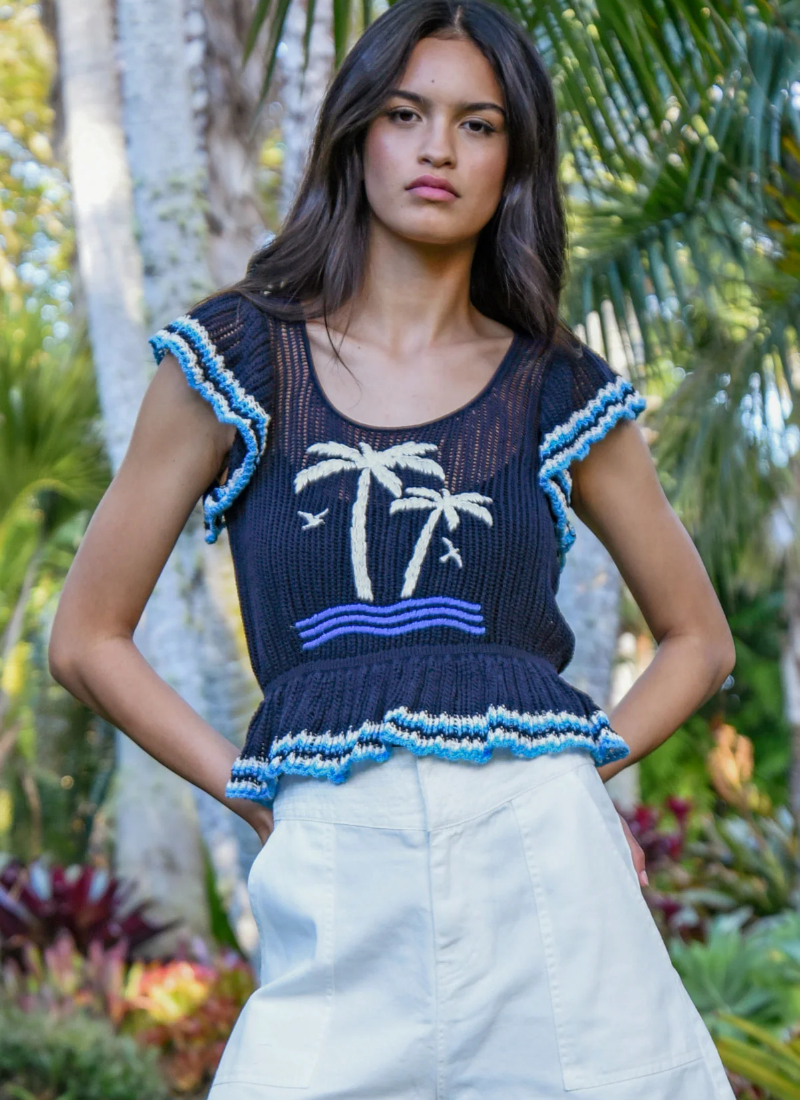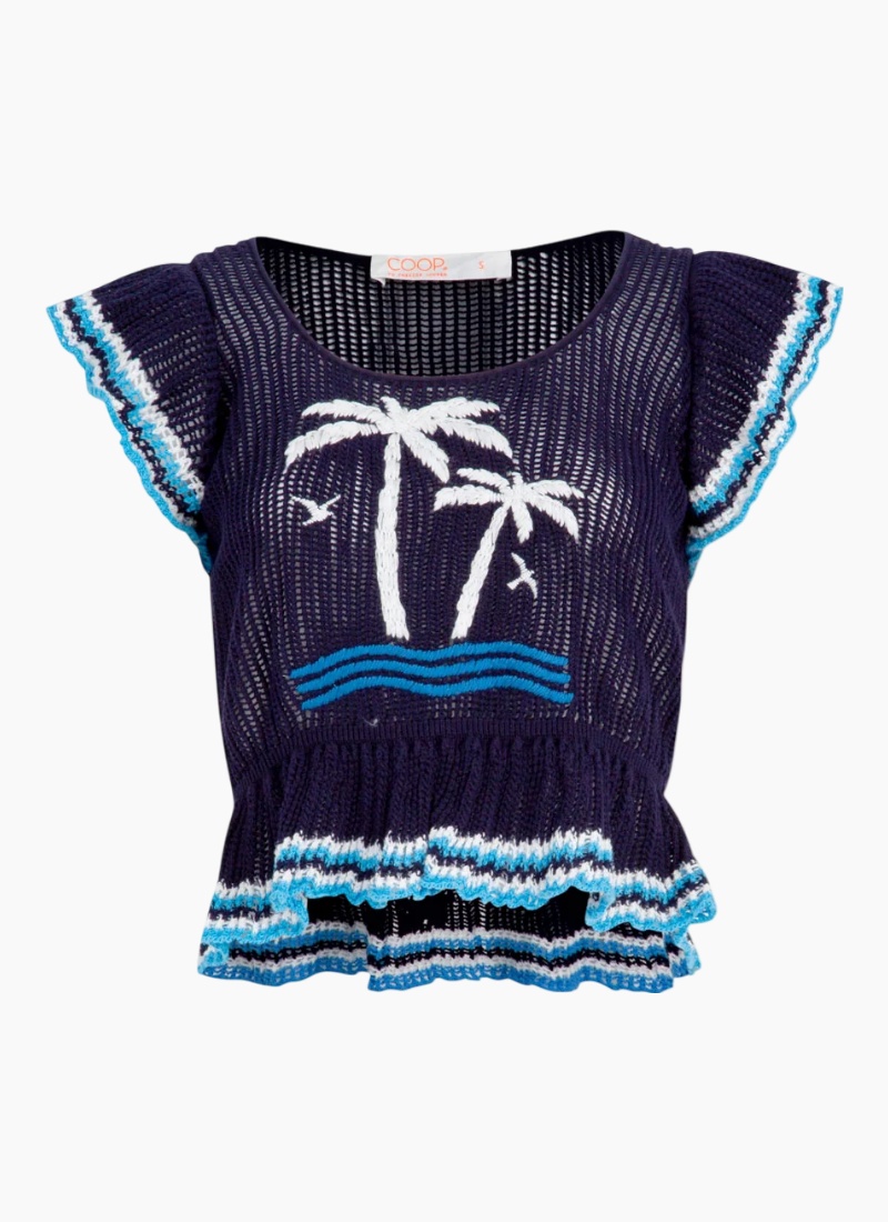 Introducing the Palms Away Crochet Top & Camisole Navy/Blue from COOP. This breezy, handcrafted fashion top brings playful seaside charm with palm-motif embroidery and delicate ruffled edges.