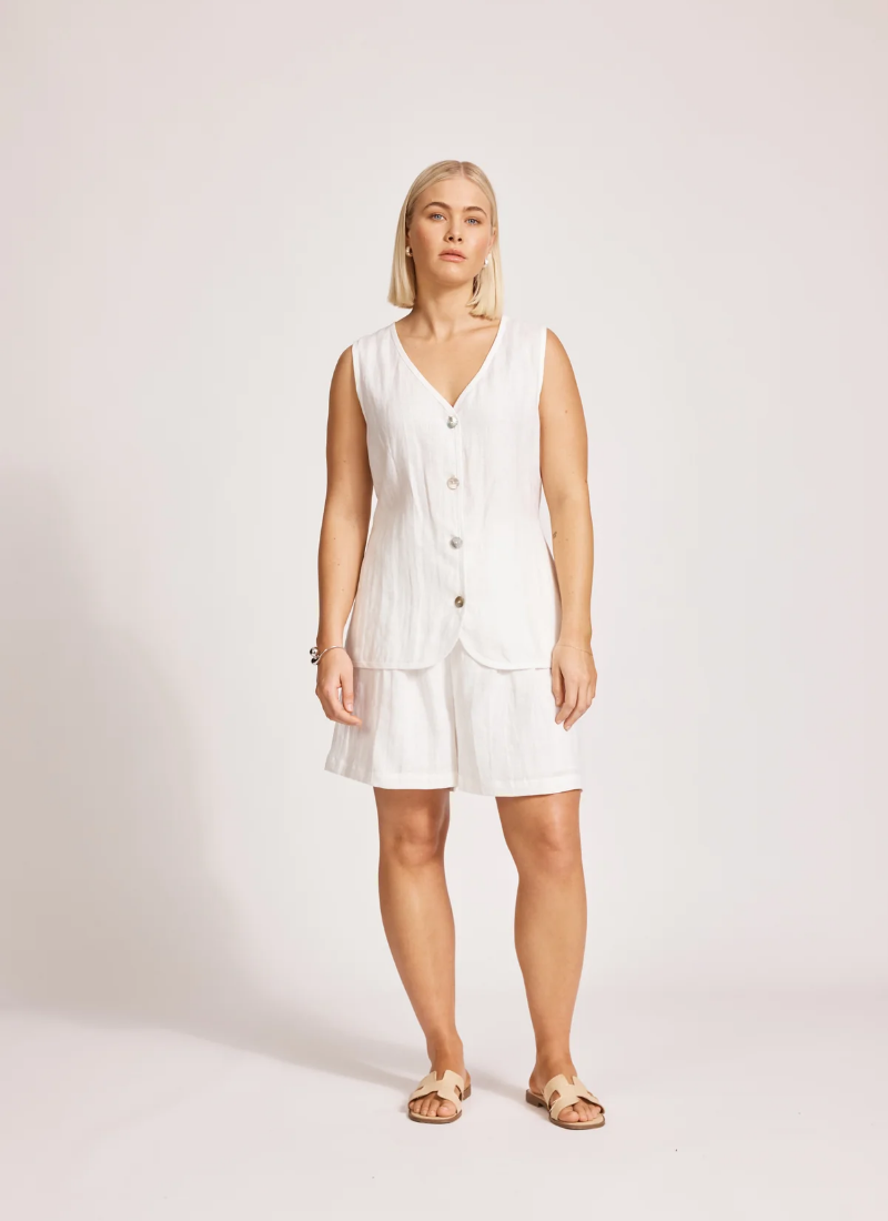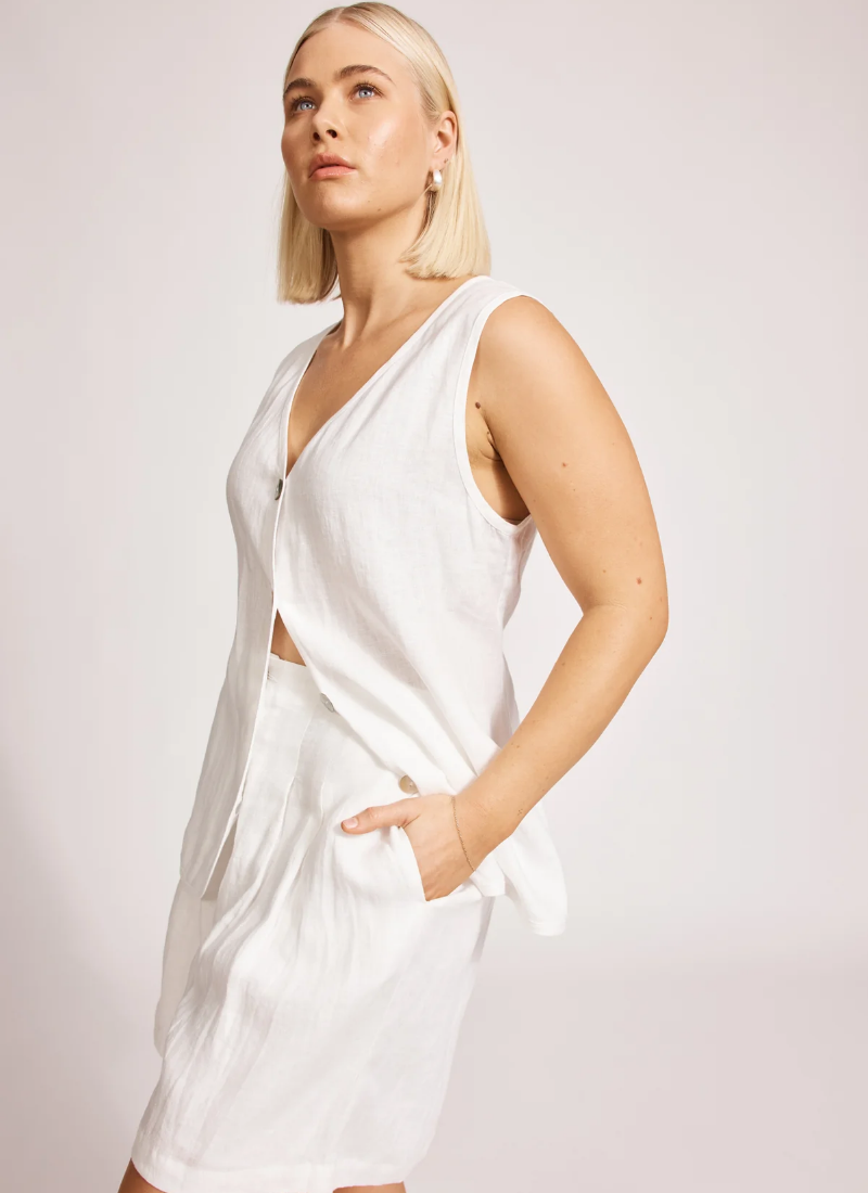 Featuring front button fastenings and a D-ring detail at the back for adjustable waist shaping, this vest offers a flattering curved hemline and a relaxed silhouette. Crafted from 100% linen, it combines comfort with effortless style.