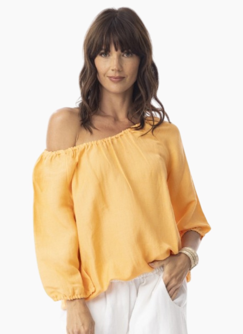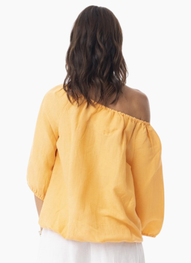 Introducing the Escape Linen Solid Gather Top. This breezy one-shoulder linen top channels effortless summer style with a soft gathered neckline.