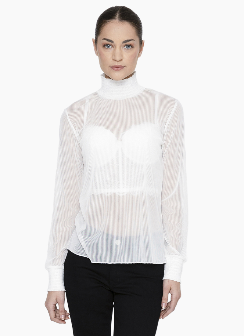 This basic is just a little special with a high shirred neck and cuffs adding a touch of sophistication to this sheer, sparkly or striped garment. Perfect for a night out or special occasion. Wear with the Rayon Tank or a beautiful longline bra to complete your look. Great layering piece. A 3 button neck closure.