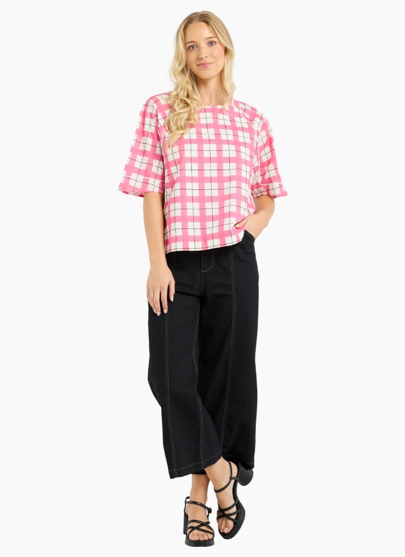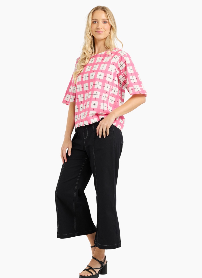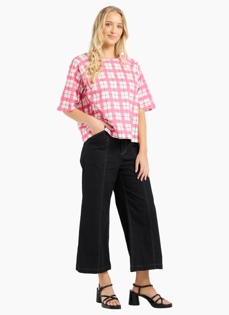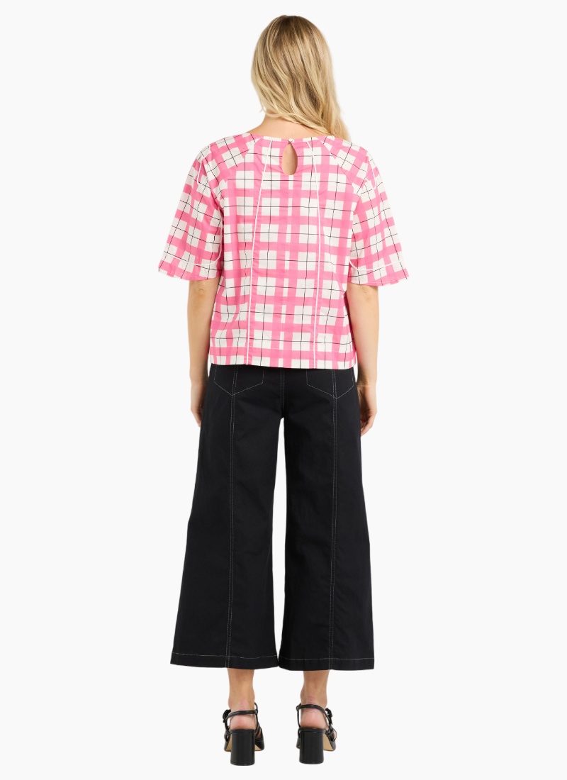 A contemporary take on the classic shell top, this short-sleeved style blends clean lines with subtle fashion detailing. Cut from crisp cotton for a lightweight yet structured feel, it features a not-quite-tee silhouette—streamlined and elevated. Contrast tape accents add a refined edge, offering a directional finish that makes this a wardrobe must have. 100% Cotton