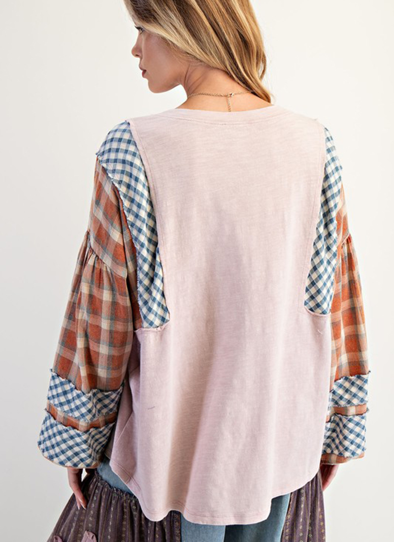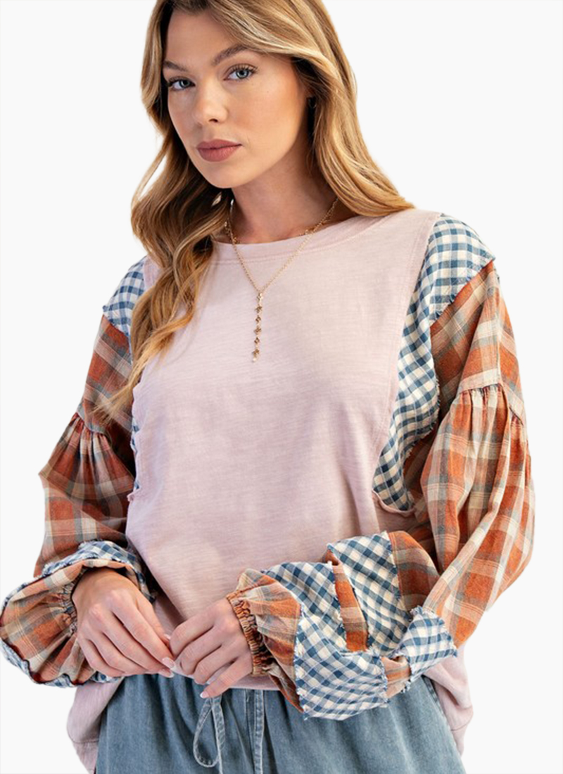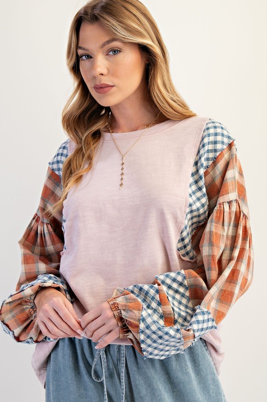 Plaid print sleeves come together with a mineral washed cotton top you'll wear on repeat.