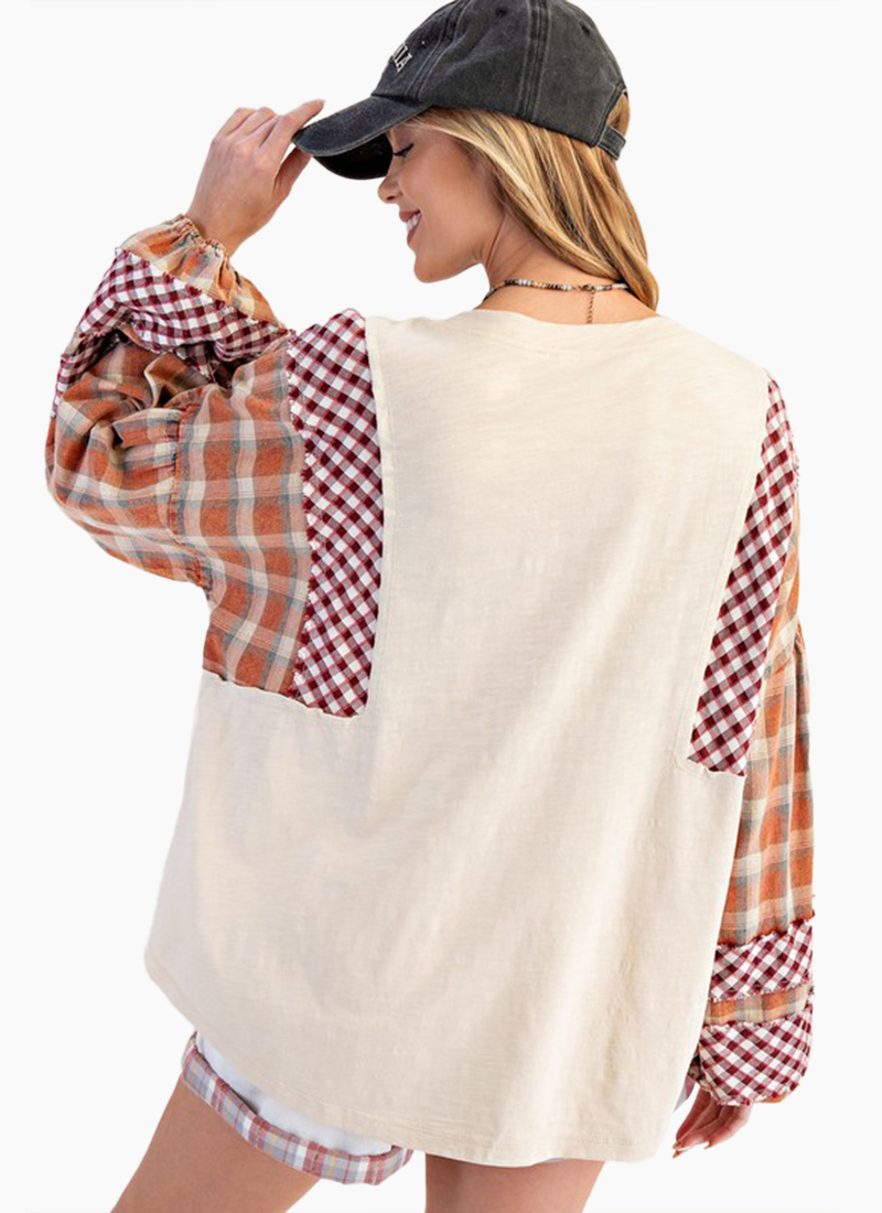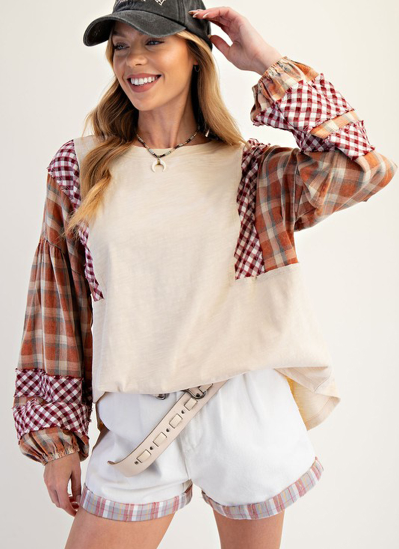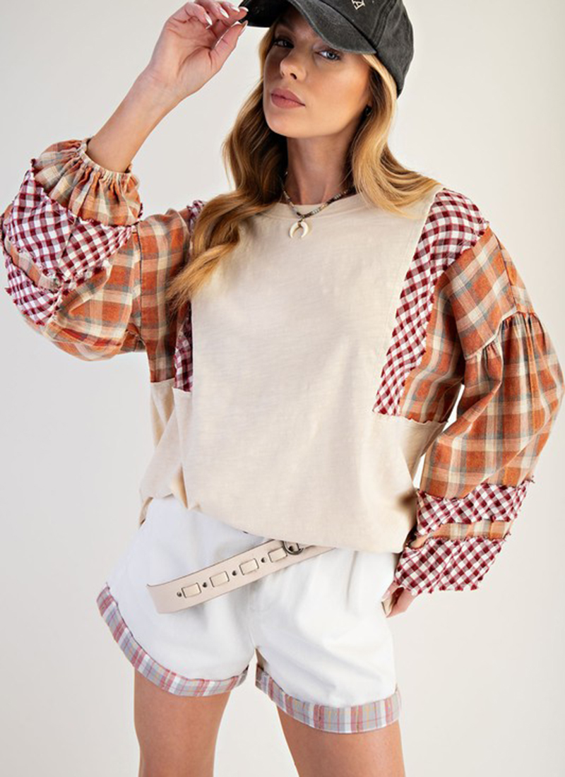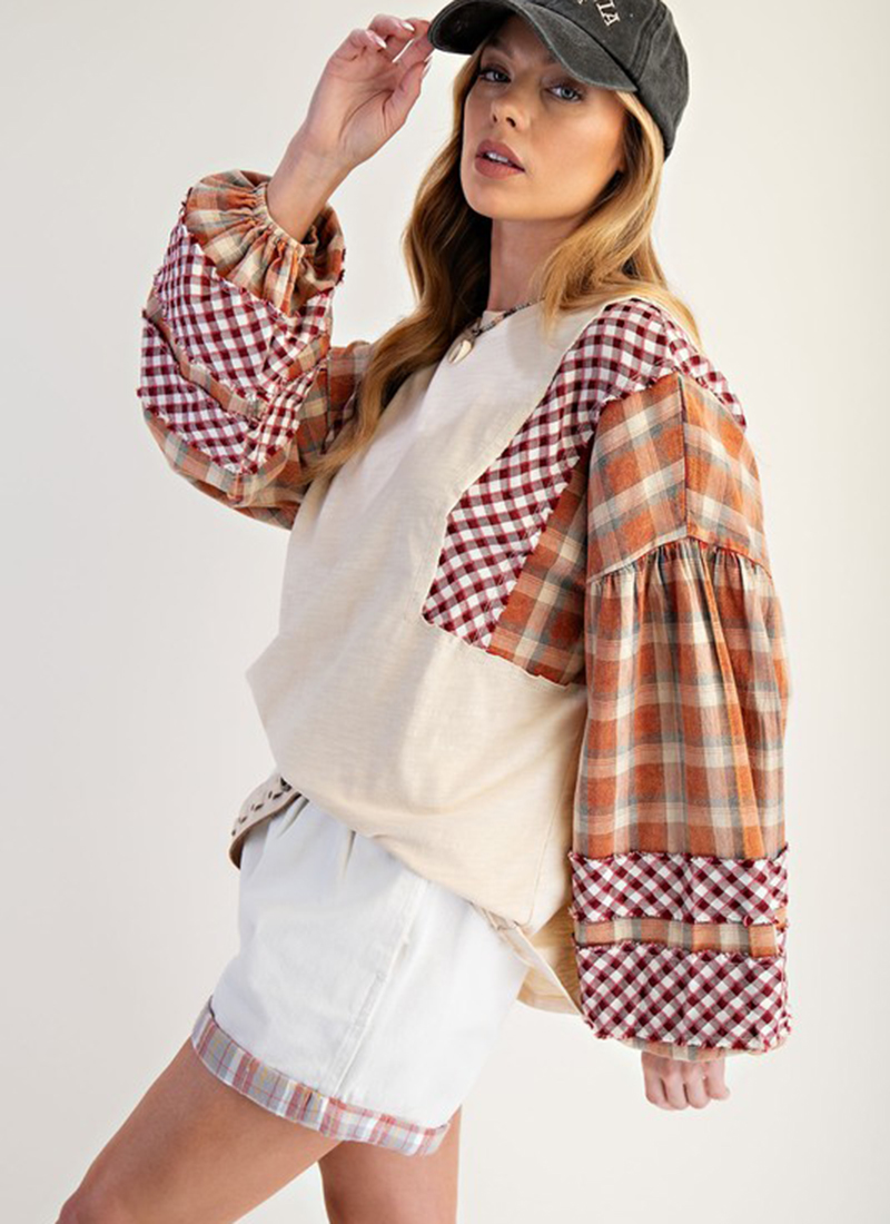 Plaid print sleeves come together with a mineral washed cotton top you'll wear on repeat.