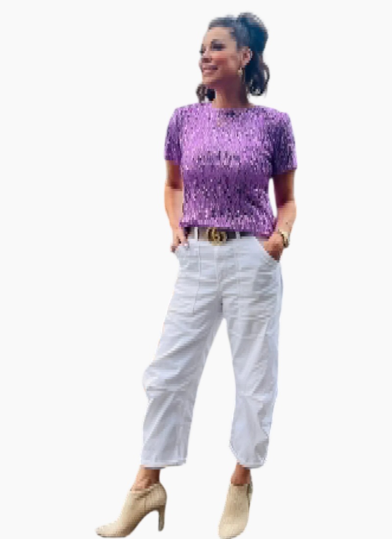 - Finished in lilac sequins on a lightweight polyester backing for brilliant shine and comfortable wear