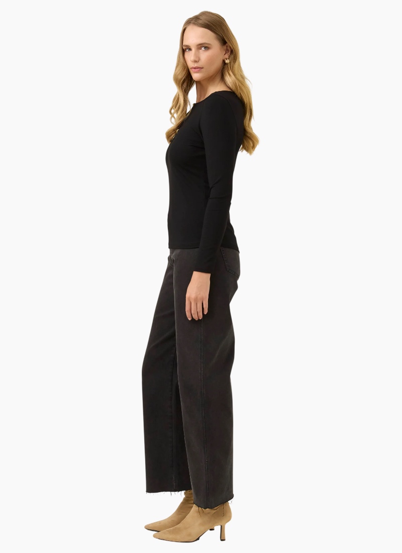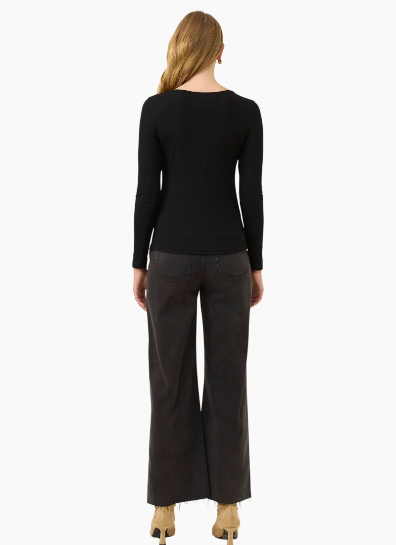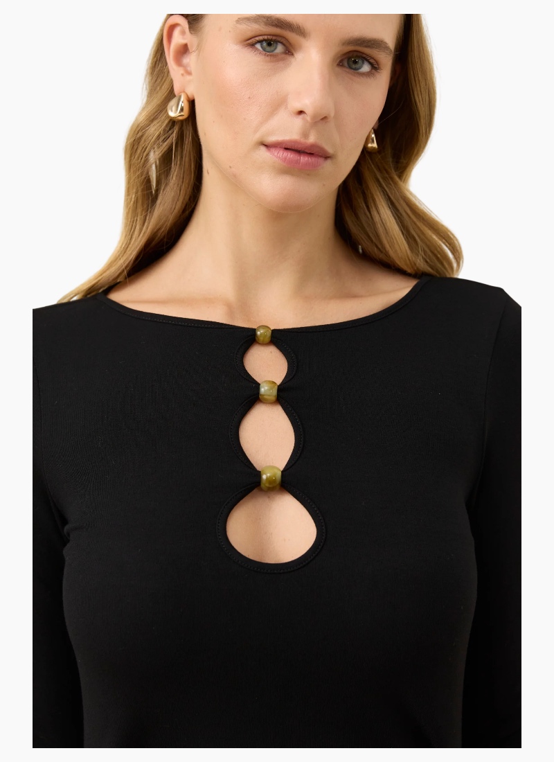 A modern wardrobe staple with a subtle statement detail, this soft jersey top is crafted from a smooth, mid-weight stretch fabric that creates a flattering line through the body. Three delicate cut-outs at the neckline are finished with bead detailing for an elevated twist, while the long sleeves and comfortable stretch make it perfect for everyday winter layering. Style with wide-leg trousers or pair with the Sloane Denim Pant for an effortless, polished look. Design Features Soft mid-weight jersey fabric Generous stretch for comfort Full-length sleeves Three front neckline cut-outs with bead detailing