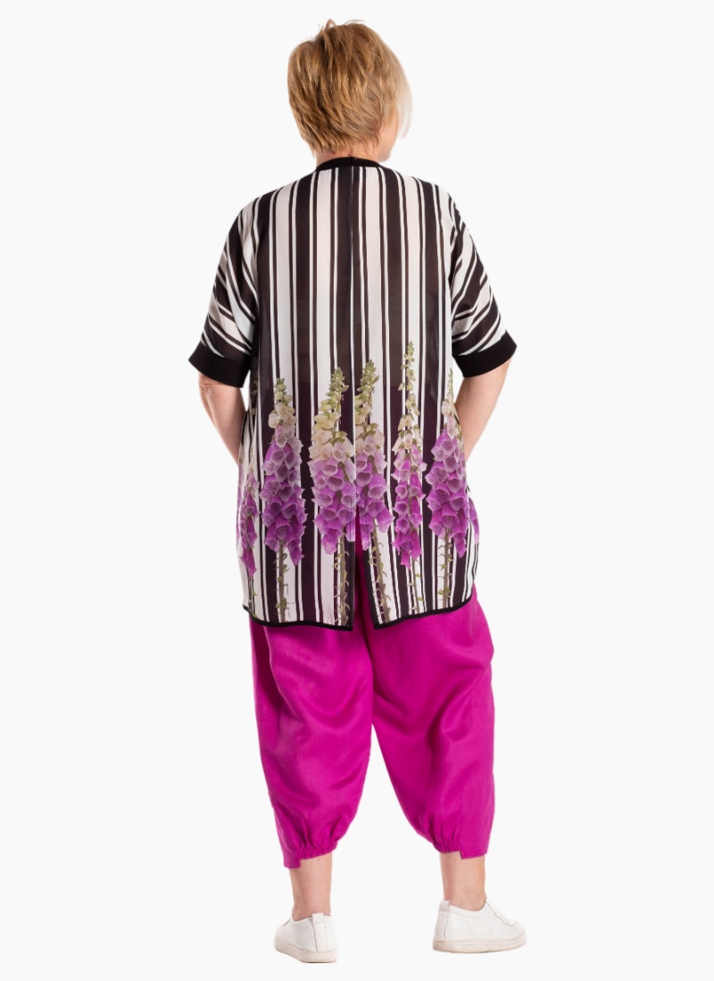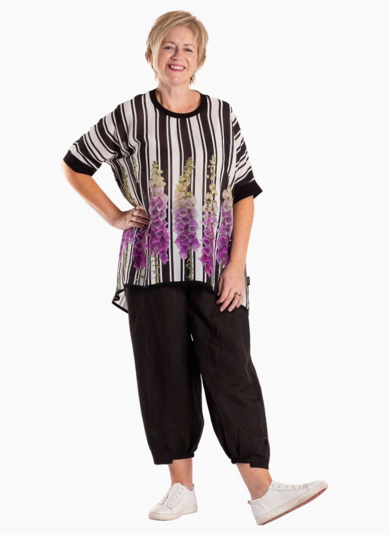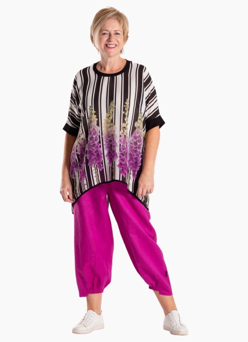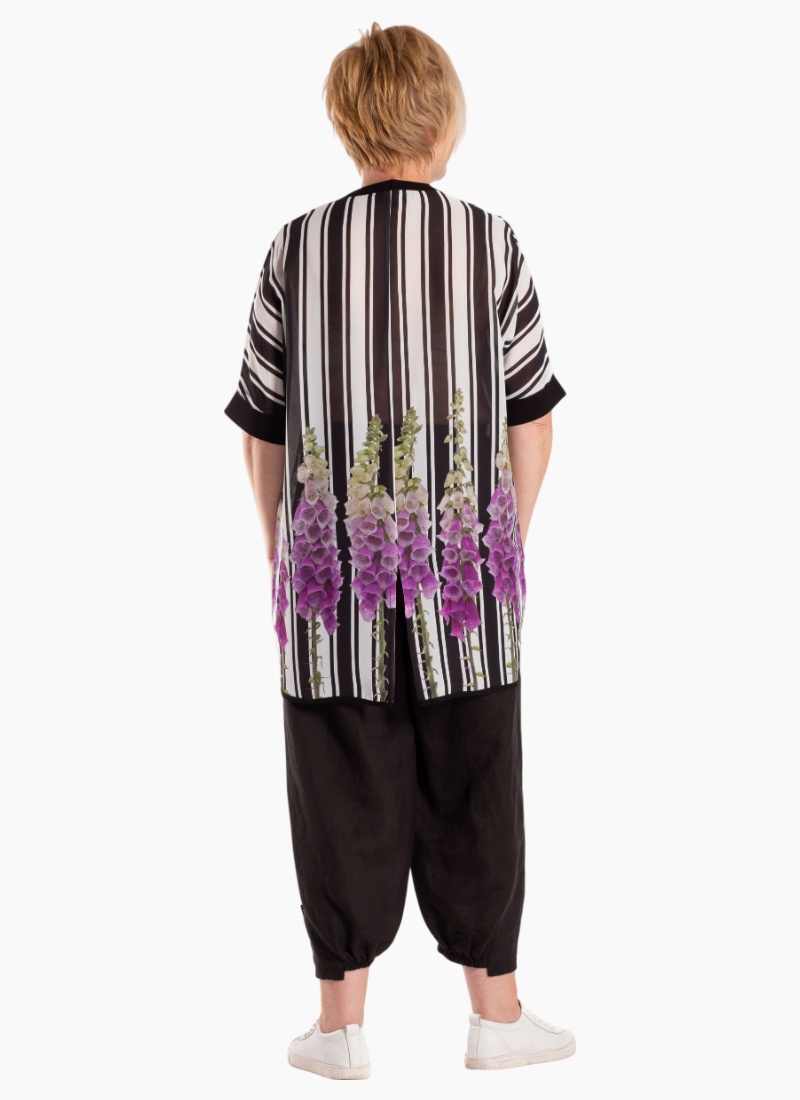 Introducing the Relaxed Fit Top Foxglove from Jellicoe. This easy-to-wear, artfully printed fashion top pairs bold vertical stripes with delicate foxglove blooms for a contemporary, flattering look.