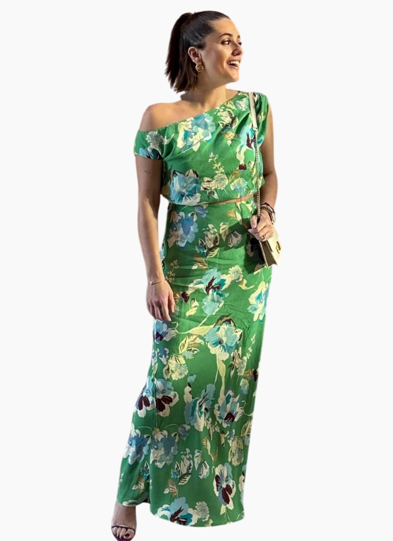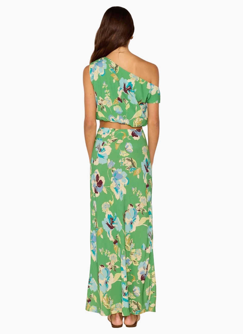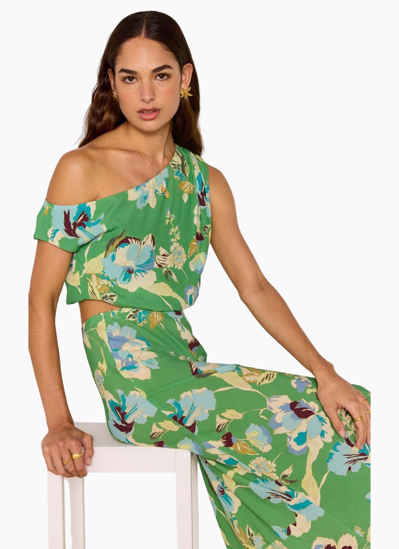 - Green Floral from MinkPink. This breezy, feminine Tops piece brings a vibrant green floral print to your wardrobe with a modern off-shoulder silhouette.