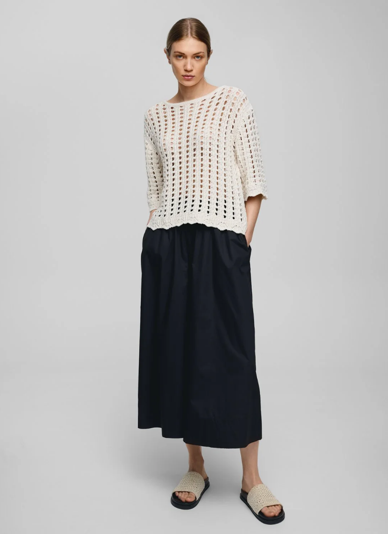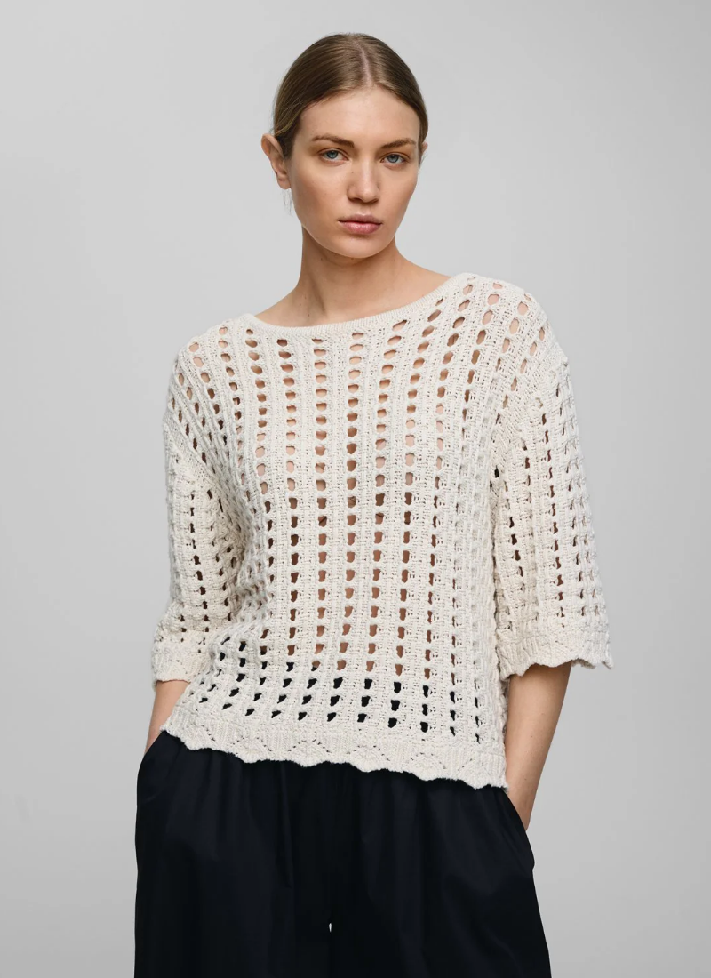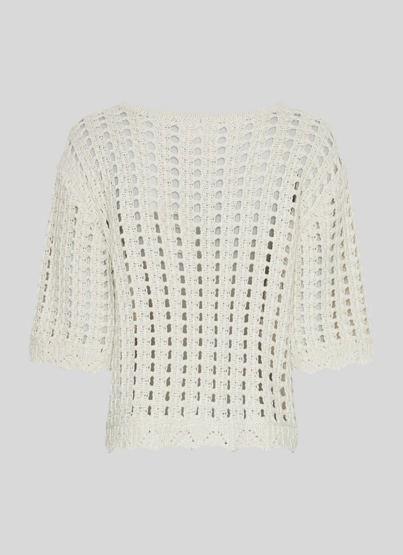 Fairyin is a new knitted style at MSCH Copenhagen. The pullover has a boat neck, short sleeves with dropped shoulders and an open knit design.