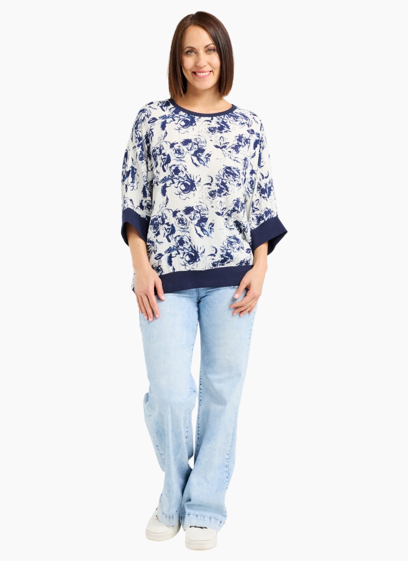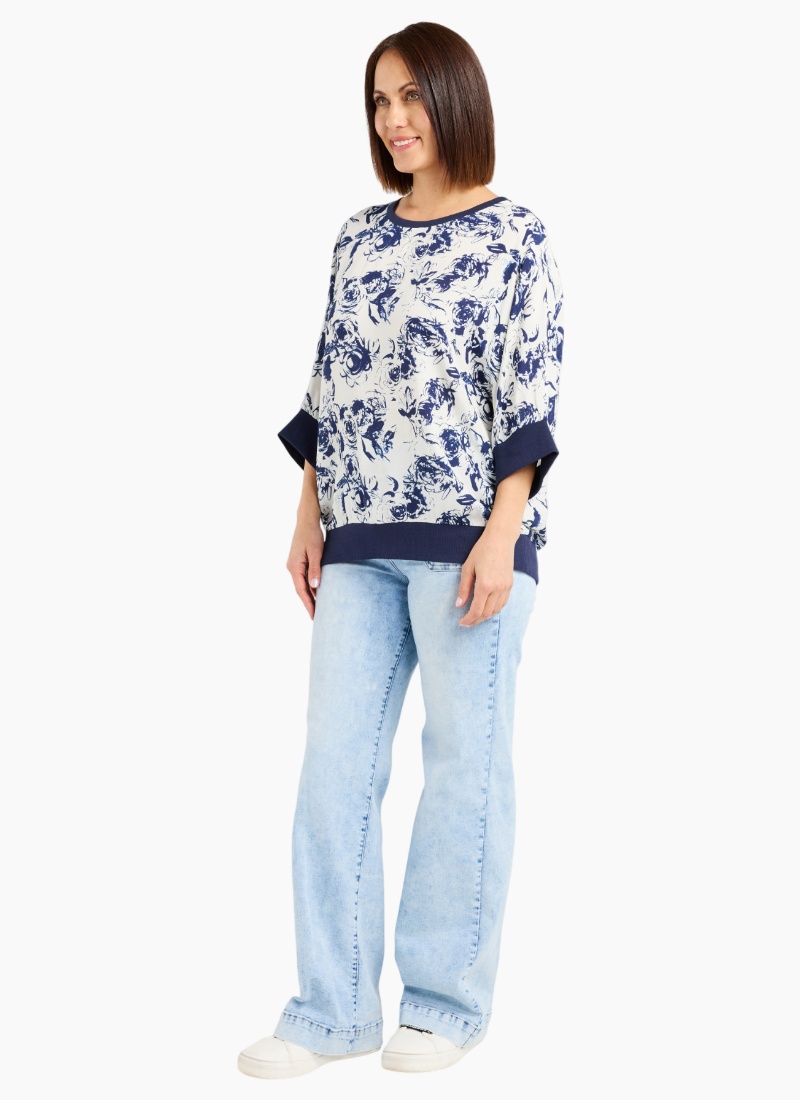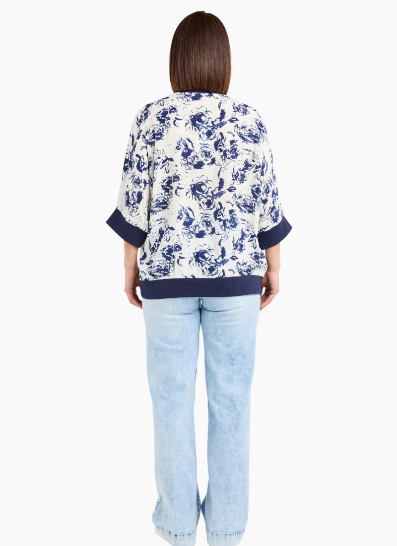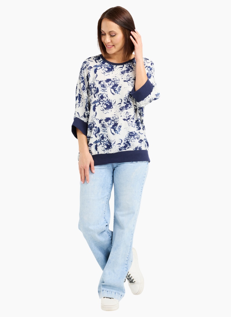 This relaxed-fit top features below-elbow sleeves finished with wide blue elasticated cuffs and a matching hem for a polished, comfortable fit. Crafted in a fresh blue and white floral fabric, it brings a light, cheerful touch to winter layering while keeping an effortless silhouette.