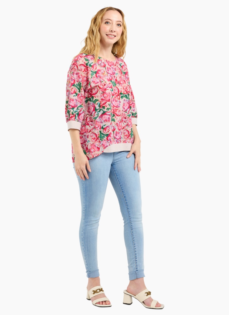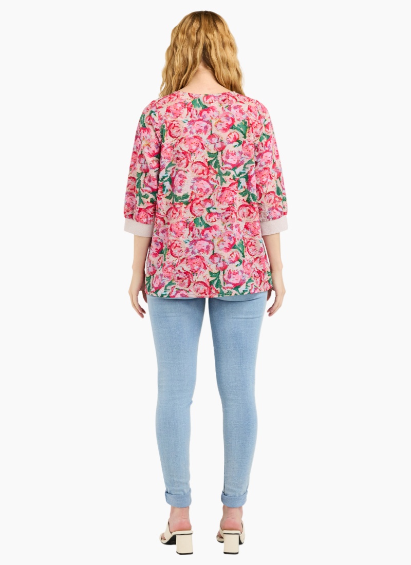 - All-over pink floral motif with ribbed cuffs and hem adds interest and polish to the Fashion Tops category