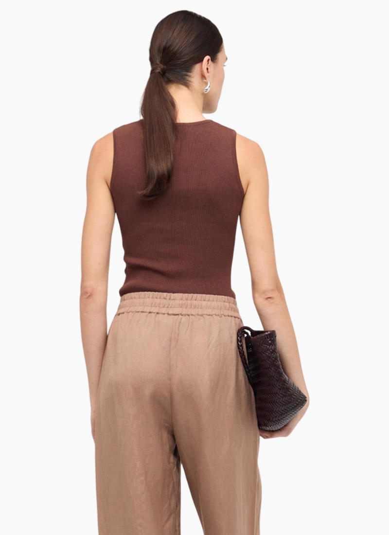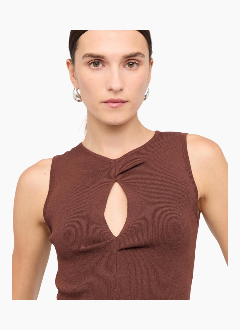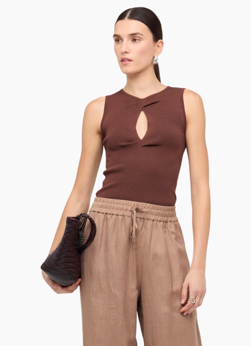 Introducing the Arden Cutout Knit Top from Staple the Label. This chocolate ribbed knit is a sculpted, modern wardrobe essential.