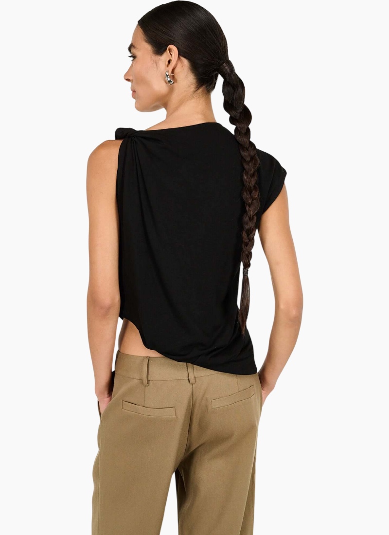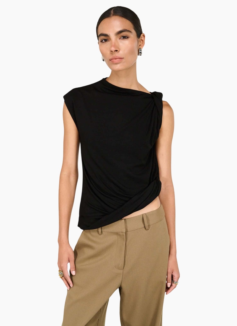 The Eva Black Twist Asymmetric Tank is a refined essential, designed to drape effortlessly over the body. Crafted from a soft stretch fabrication, it features an elegant high neckline and a statement twist detail at the shoulder, creating soft gathers through the silhouette. The asymmetric hem adds subtle movement, offering a modern shape that feels both effortless and elevated. Style with tailored trousers or sleek denim for understated impact. Features: Soft stretch fabrication High neckline Shoulder twist detail Draped silhouette Asymmetric hem finish Relaxed fit