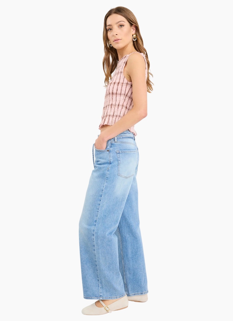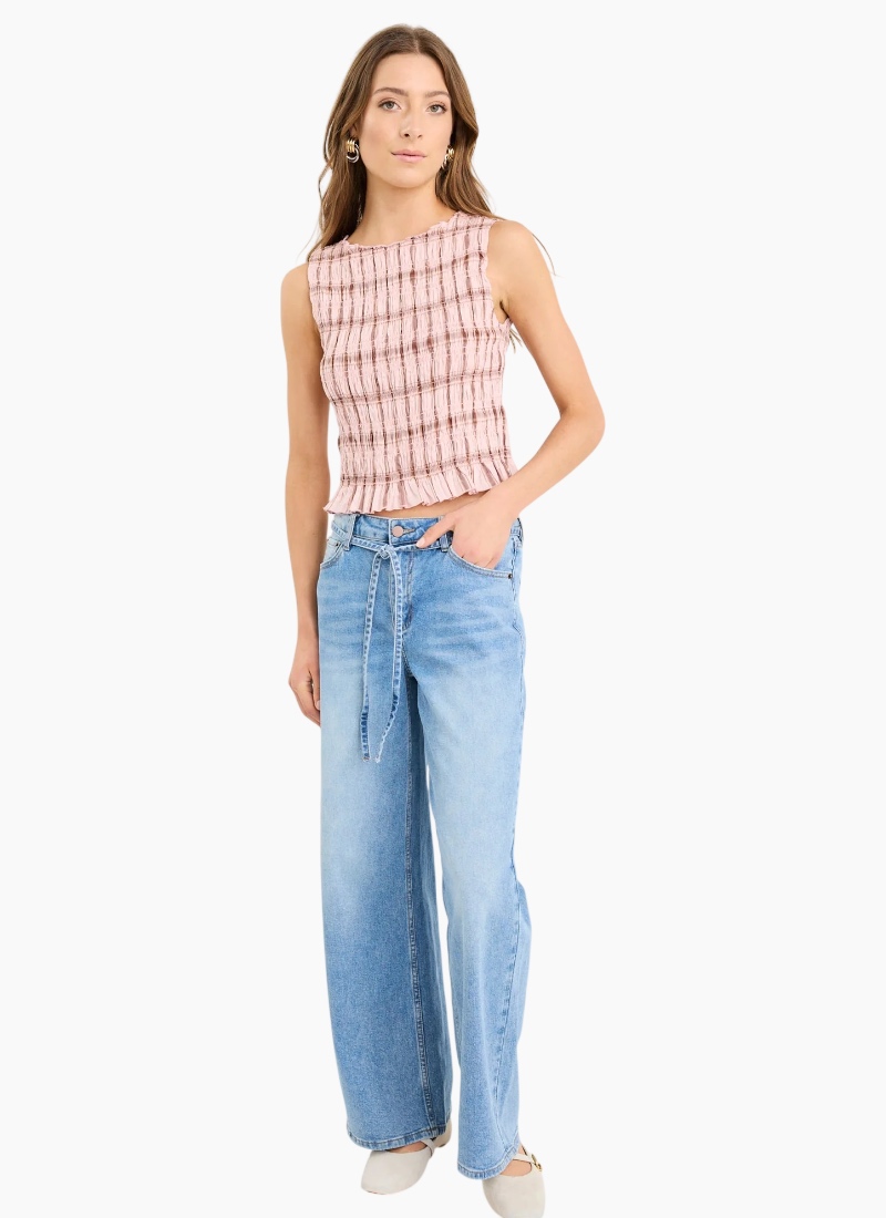 Introducing the Forsaken Blush Pink Check Shirred Top from Stories Be Told. This lightweight fashion top in a soft blush pink check brings a feminine, textured finish to warm‑weather wardrobes.