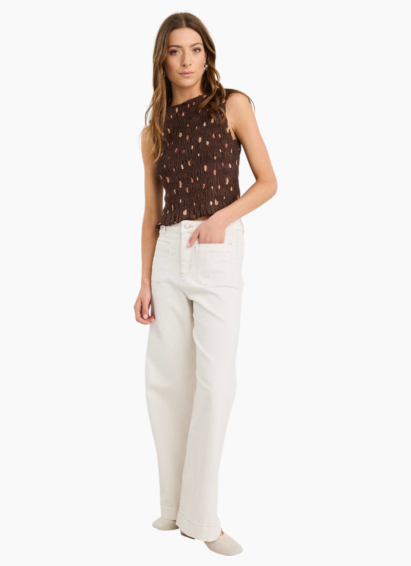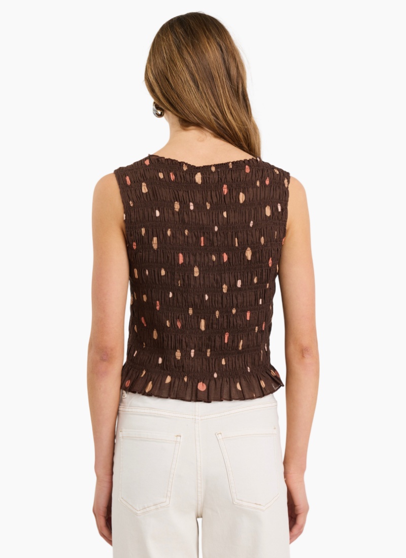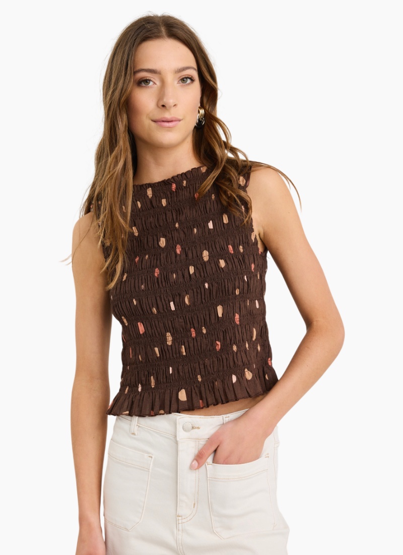 The Forsaken chocolate shell top is playful yet polished, with its textured shirring and scattered polka dot print. Cut sleeveless for a clean silhouette, it skims the body with just the right amount of stretch while the soft frill hemline adds a feminine finish. Crafted from a breathable viscose-linen blend, it’s as comfortable as it is eye-catching.Easy everyday wear made lively with print and texture.