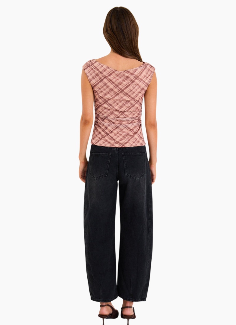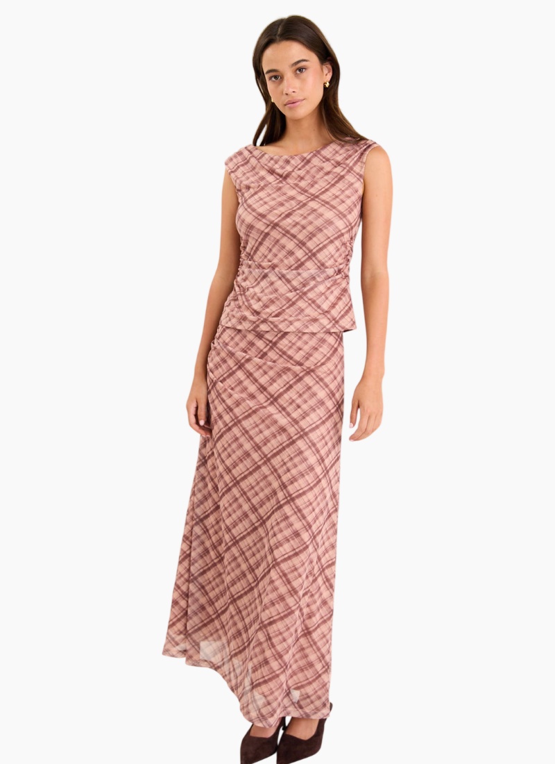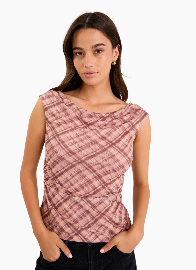 The Quartette Top brings a soft, romantic feel to your wardrobe with its dreamy blush check mesh. Designed with a flattering scoop neckline and gentle ruching through the bodice, it creates a shaped silhouette that still feels effortless for everyday wear. Pair it with denim for an easy look or style it with the Quench Blush Check Mesh Panelled Maxi Skirt for a matching moment we love.