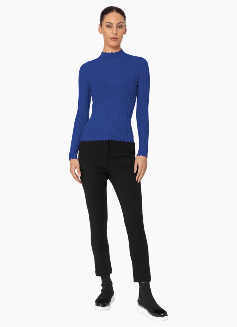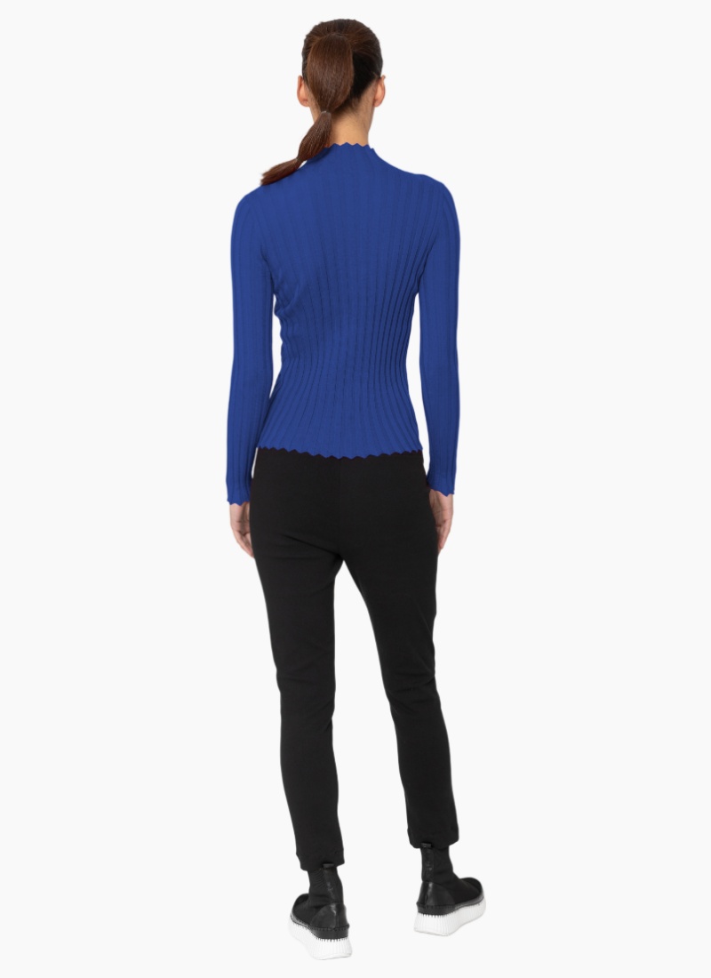Introducing the K763 Derby Top from Two by Two. A sleek, figure-flattering cobalt ribbed knit designed to sit close to the body.