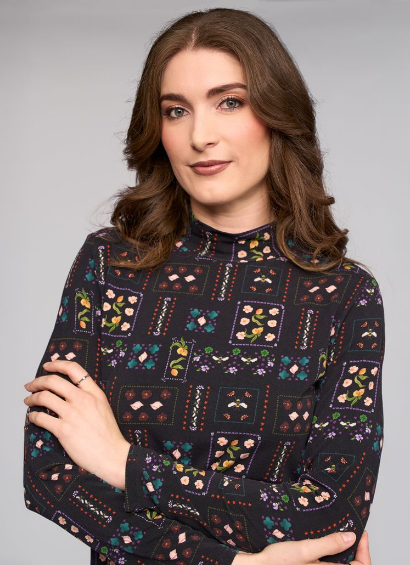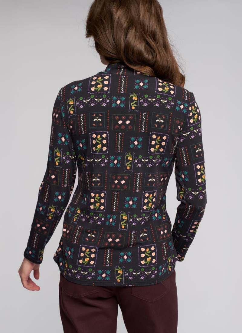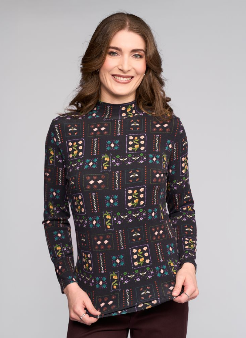 Long-sleeve high-neck top in our Haven print — a dark inky base layered with small-scale geometric and floral elements in a multi-colour palette. Cut in a slim fit from soft stretch jersey, this style works beautifully as a standalone piece or layered under jackets and knits.• Long sleeve printed knit top with high neck • Made from a soft stretchy rayon jersey fabric • Slim fit • Model wears size 10 95% Rayon 5% Elastane