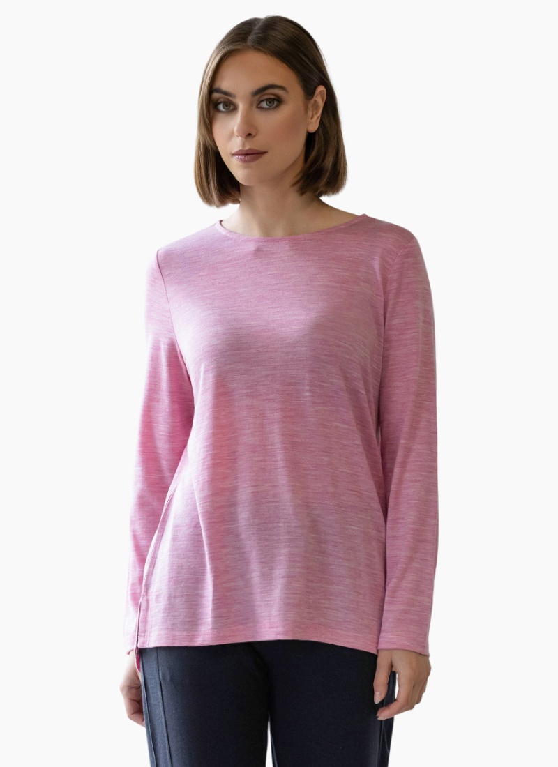 Introducing the Ivey Merino Top from Vassalli. A luxuriously soft pink marle merino top, designed for effortless layering and everyday elegance.