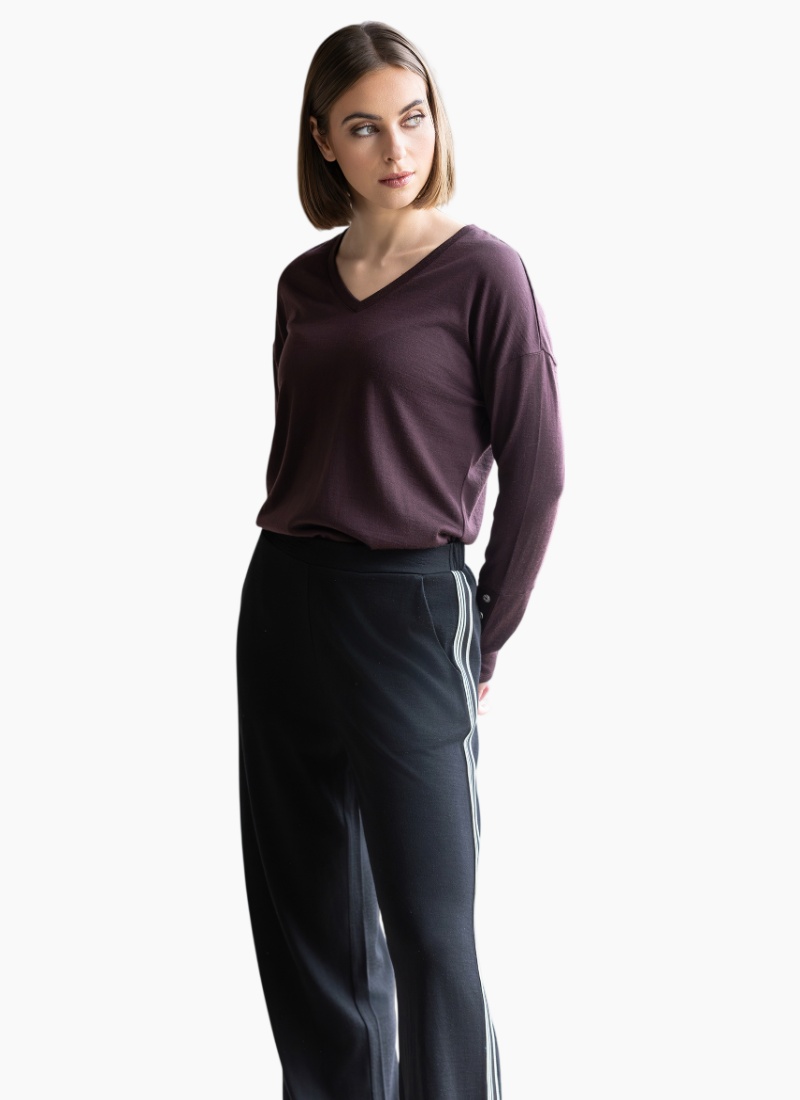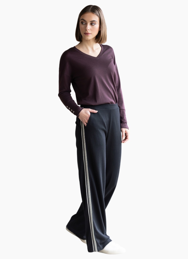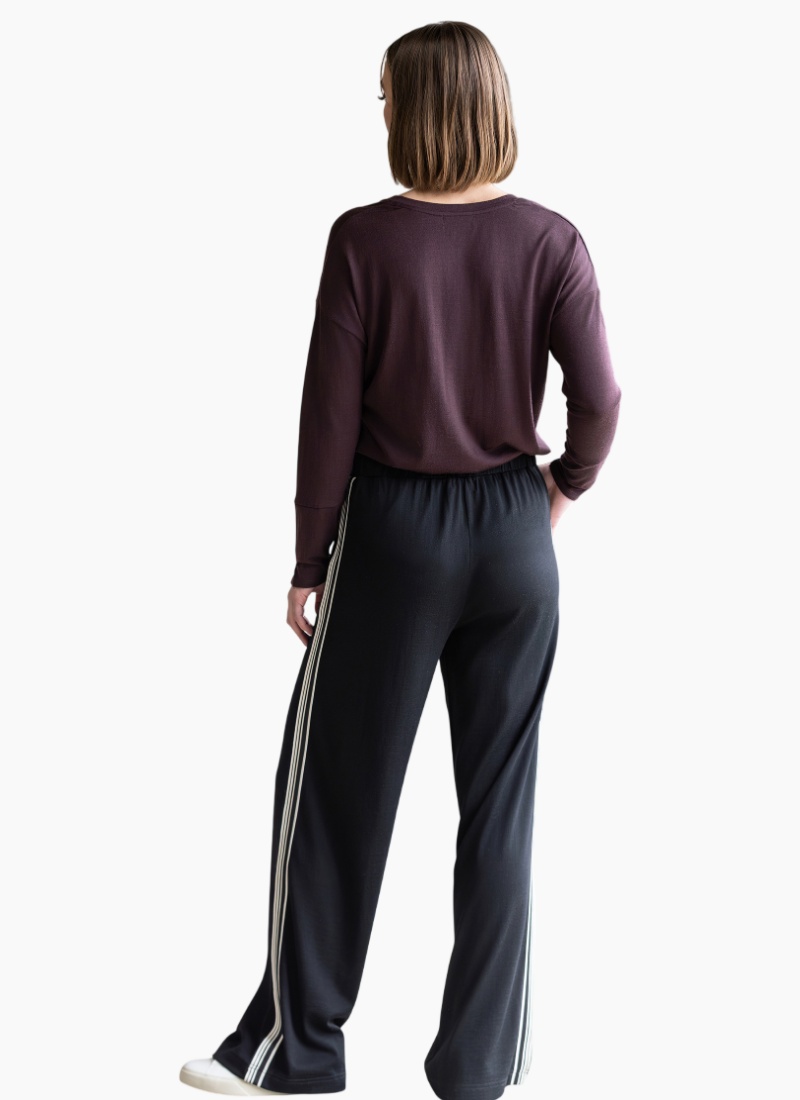 Wide-leg merino pant in BLACK. Designed with a relaxed, flowing shape and a contrast side stripe, this style combines comfort with a clean, modern look for everyday wear.• Made from soft 100% single jersey merino • Elastic back waistband with flat front • Two front side angle pockets • Wide Leg • Contrast stripe tape detail down side seams • Model is 175cm tall, wears size 10 100% Single Jersey Merino