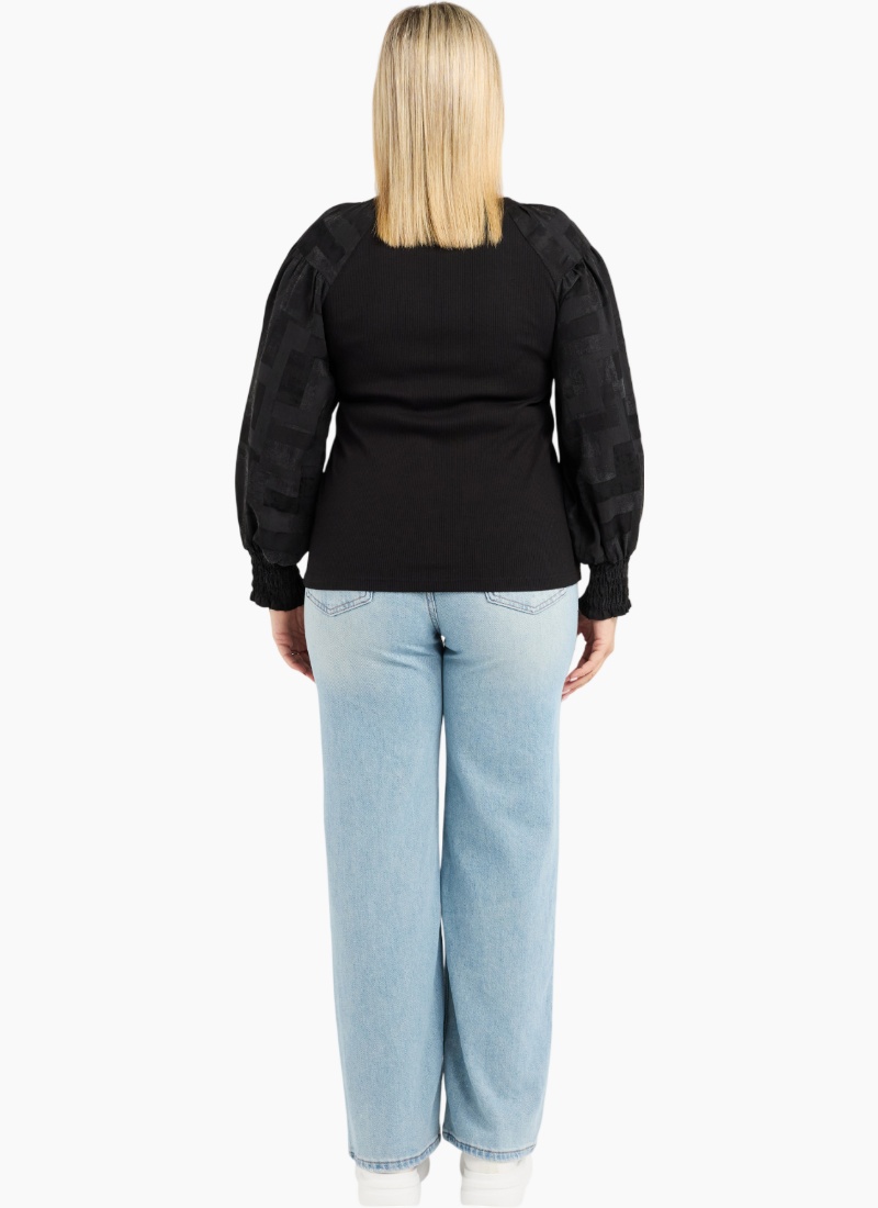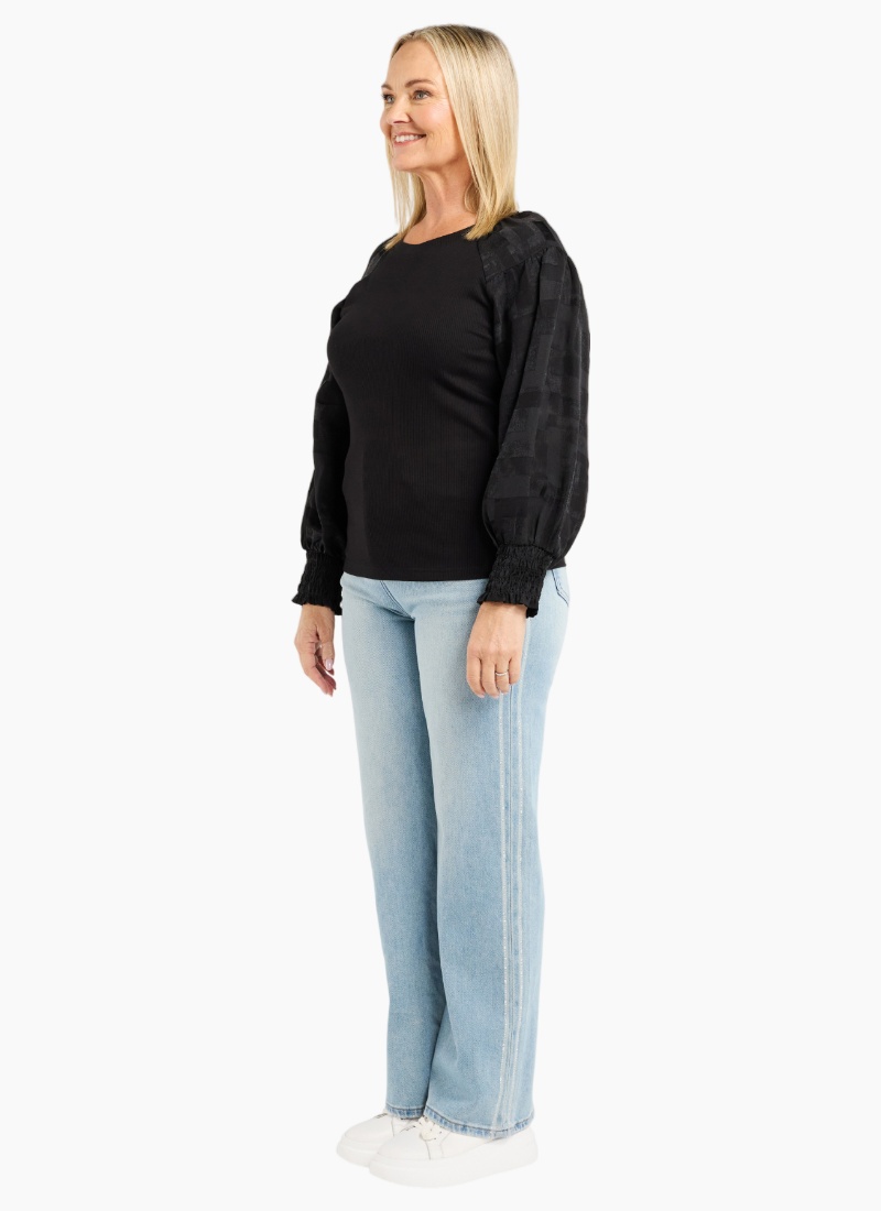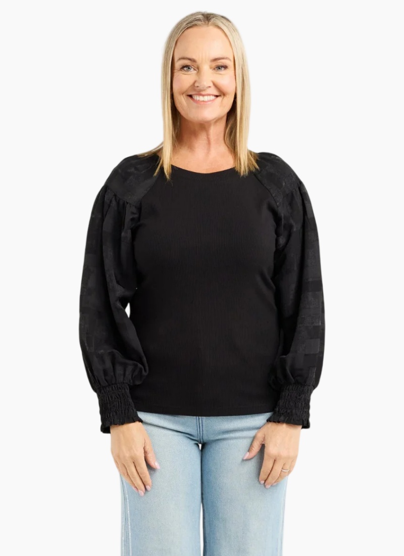 70% Bamboo 25% Cotton 5% Spx 50% Viscose 50% Tencel This long-sleeve top features a clean round neckline and a bold square sequin floral print that adds a touch of winter sparkle. Its effortless silhouette makes it easy to style with both casual and dressier looks. A standout piece for the season.