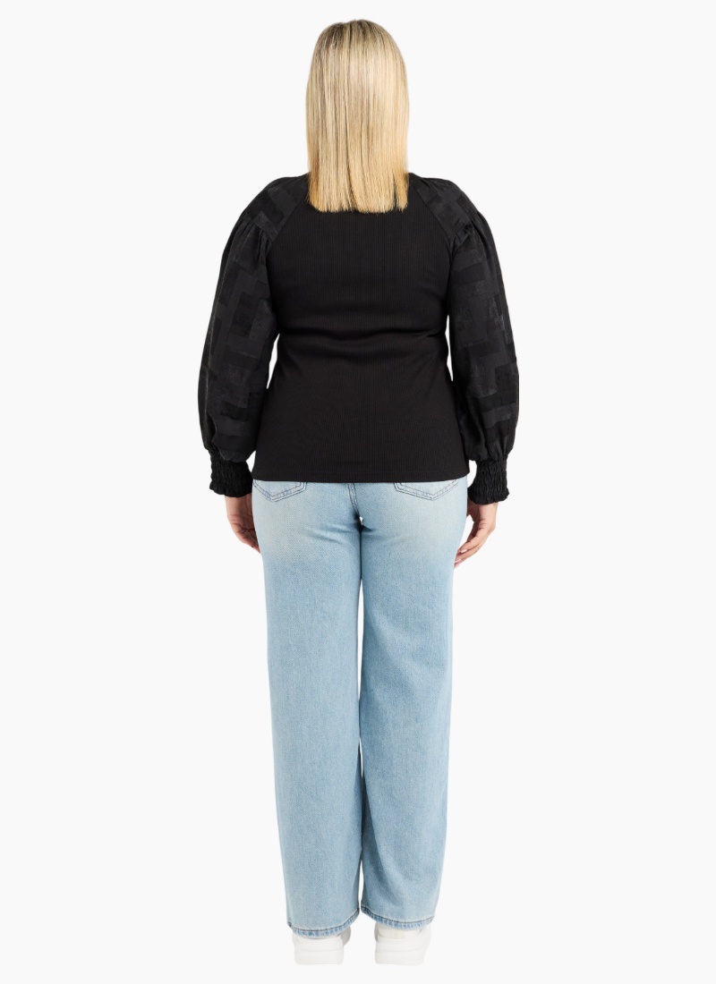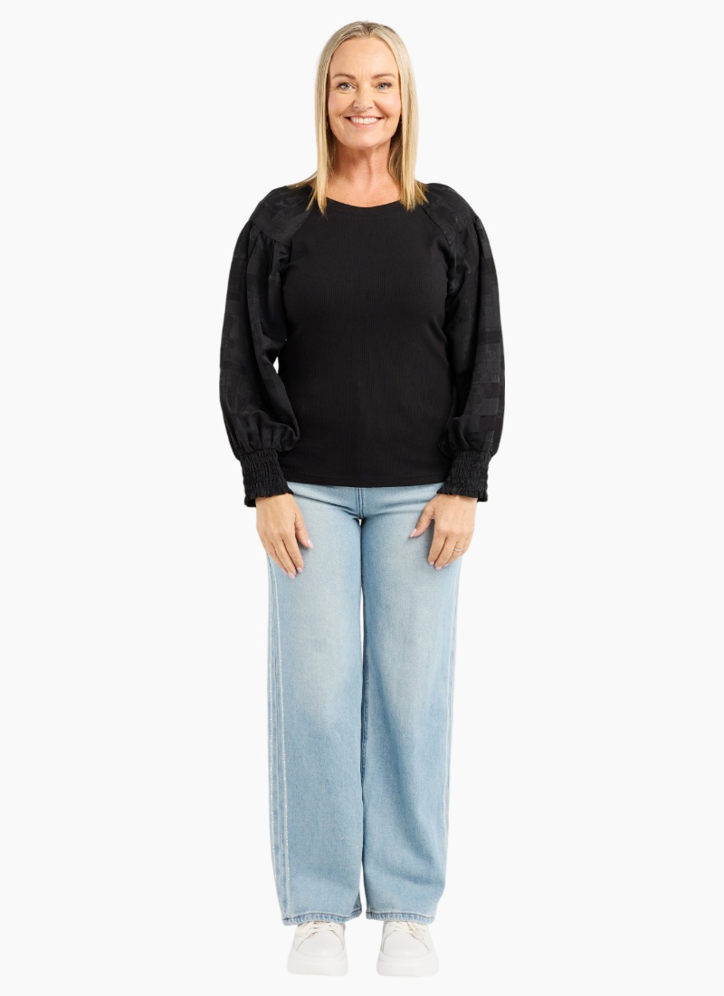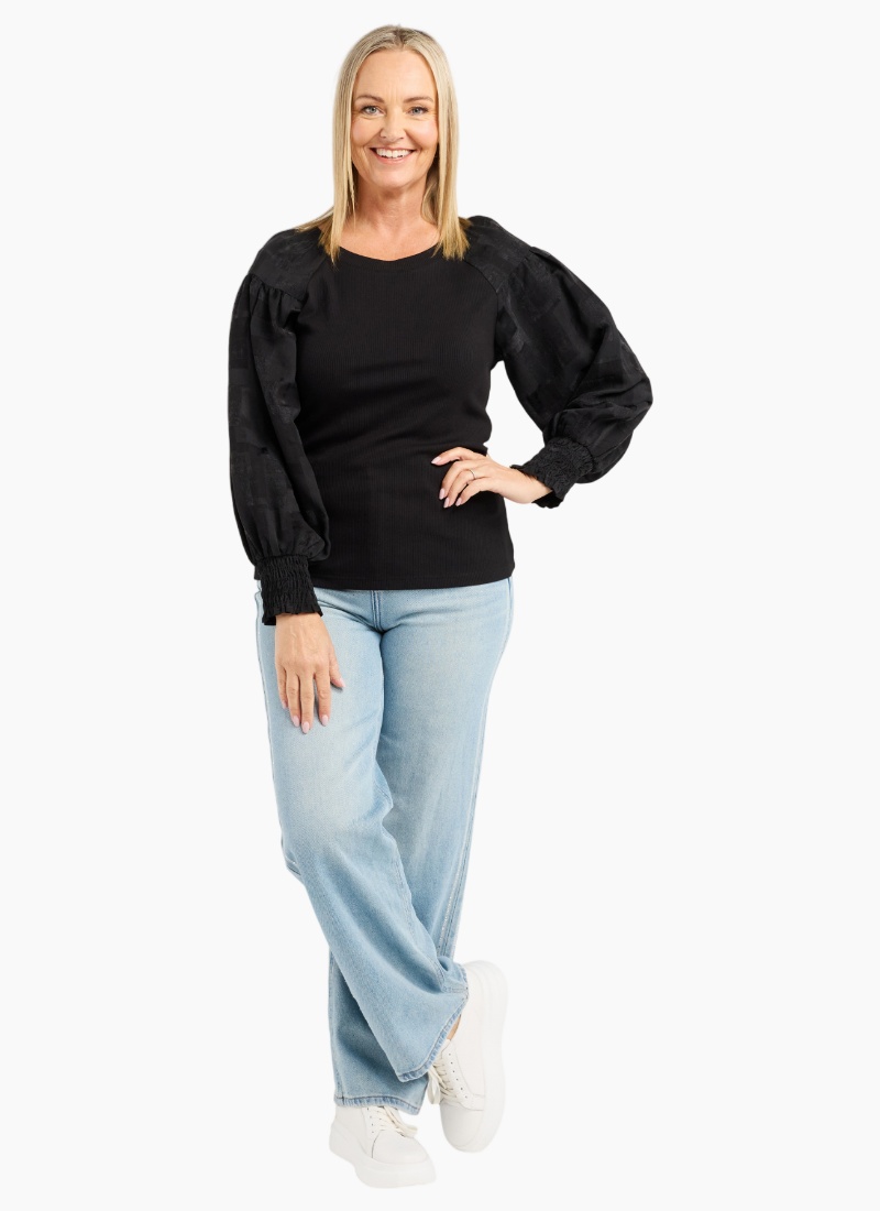 This long-sleeve top features a clean round neckline and a bold square sequin floral print that adds a touch of winter sparkle. Its effortless silhouette makes it easy to style with both casual and dressier looks. A standout piece for the season. 70% Bamboo 25% Cotton 5% Spx