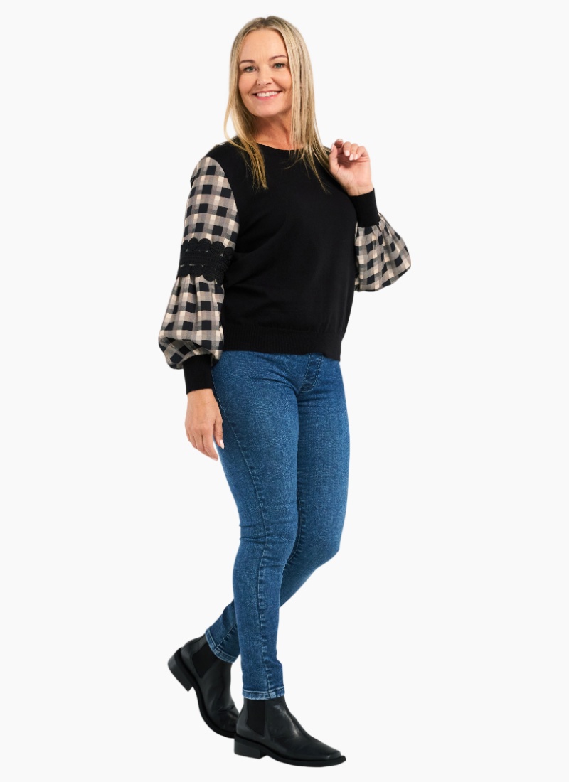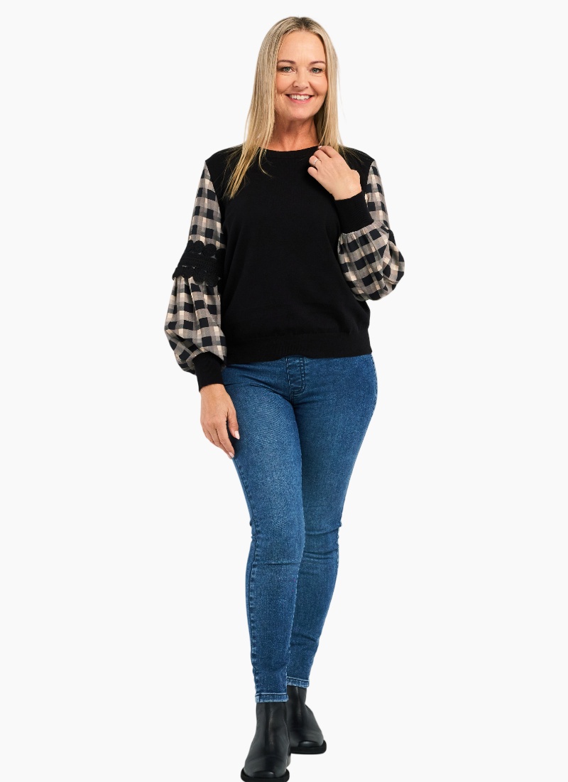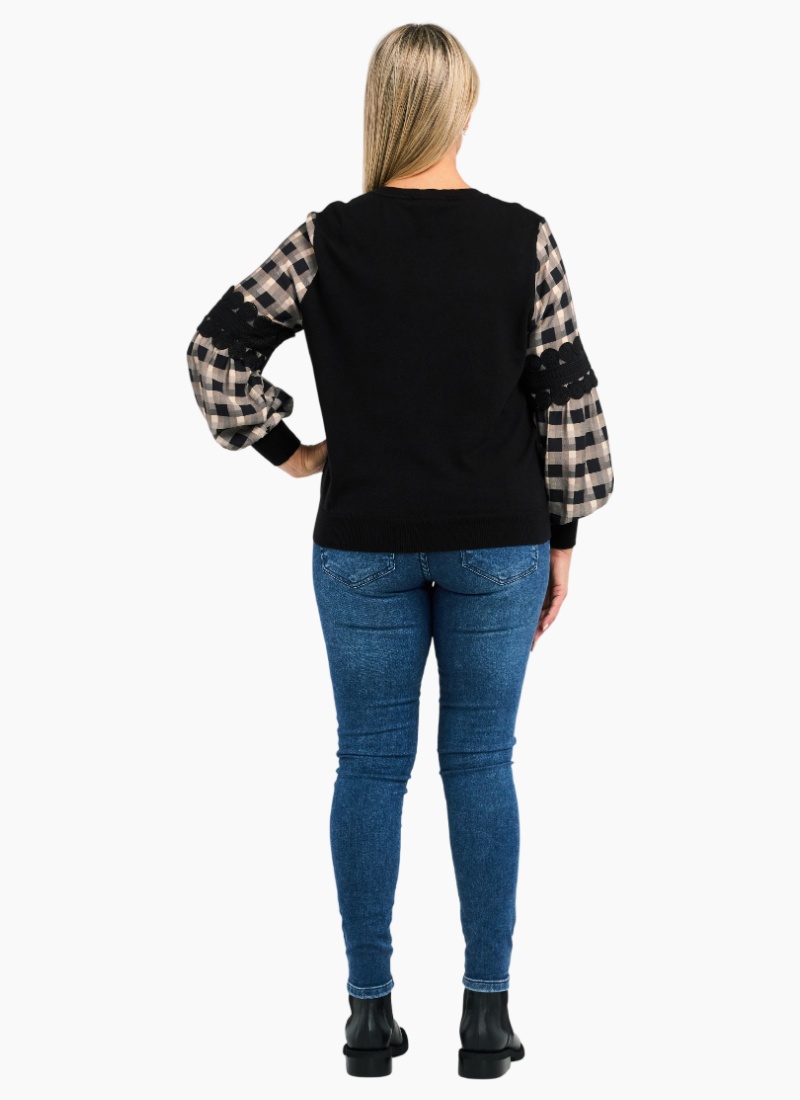 Introducing the Lilith Top from Zafina. This statement piece pairs a soft black knit body with checked puff sleeves for an easy, modern look.