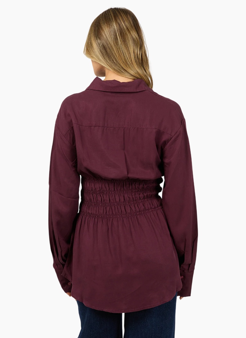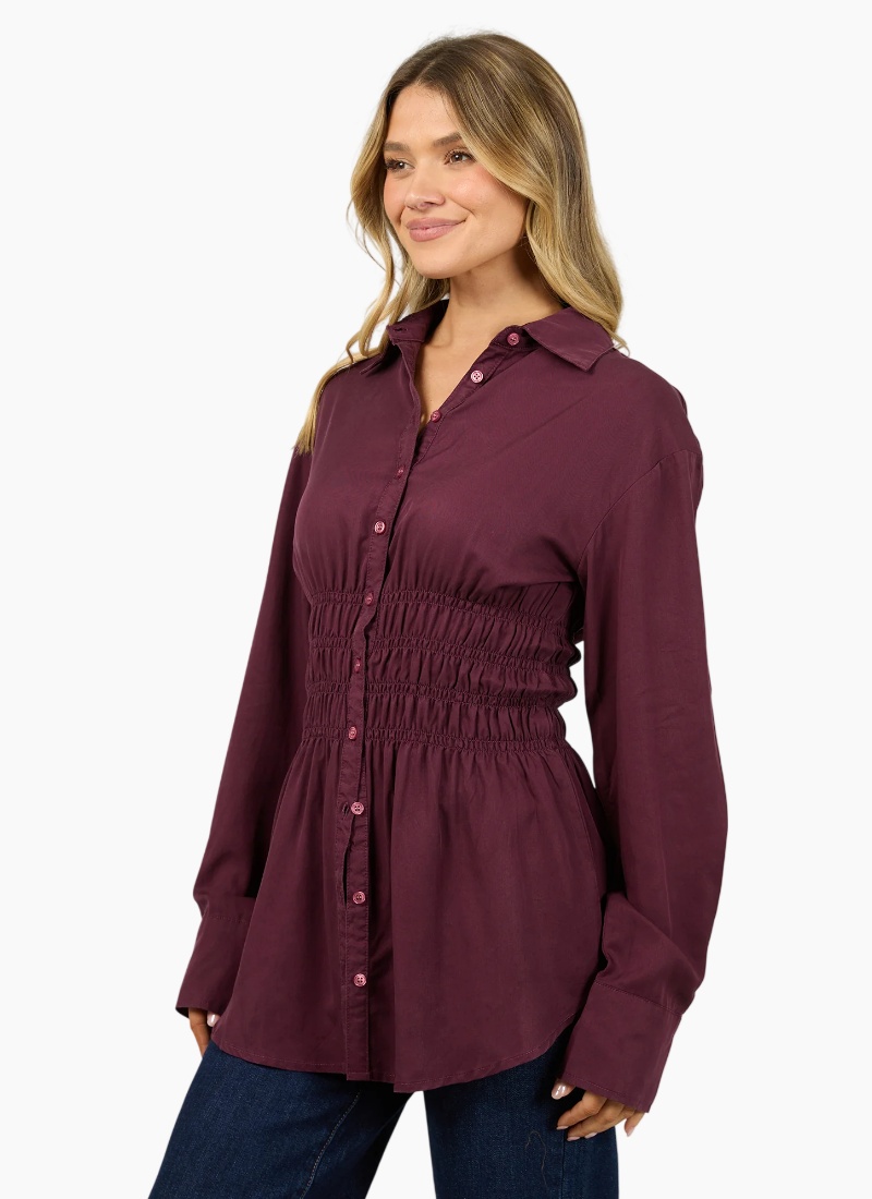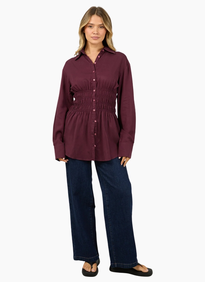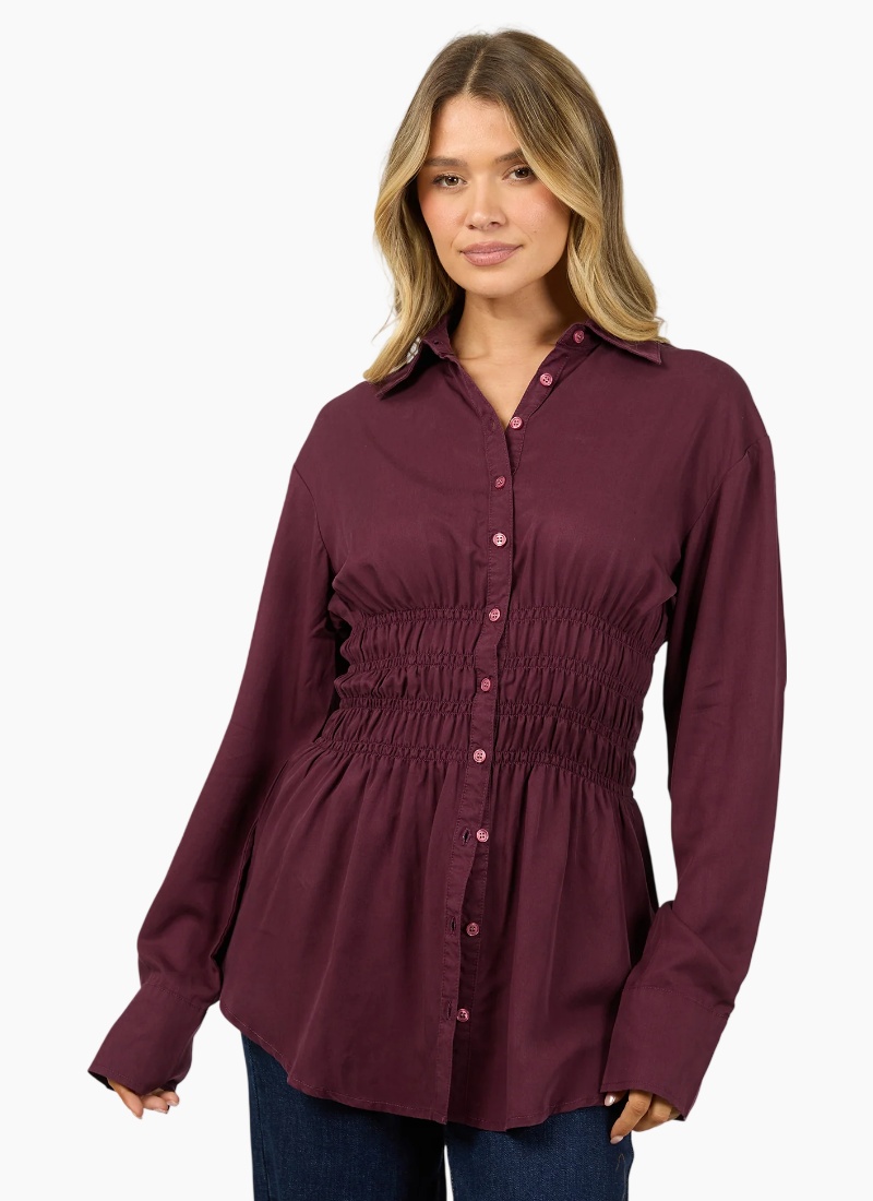 The AAE Ruched Stripe Shirt offers an elevated, timeless aesthetic. The deep tone highlights the subtle texture of the shirring, giving the piece a refined edge that transitions effortlessly from work to evening wear. Pair it with denim or tailoring for a polished look that feels confident and versatile. A true wardrobe essential, balancing femininity and structure through thoughtful detailing and a flattering, gently fitted silhouette. 100% Cotton On body fit Gather detail Model is wearing a size 8