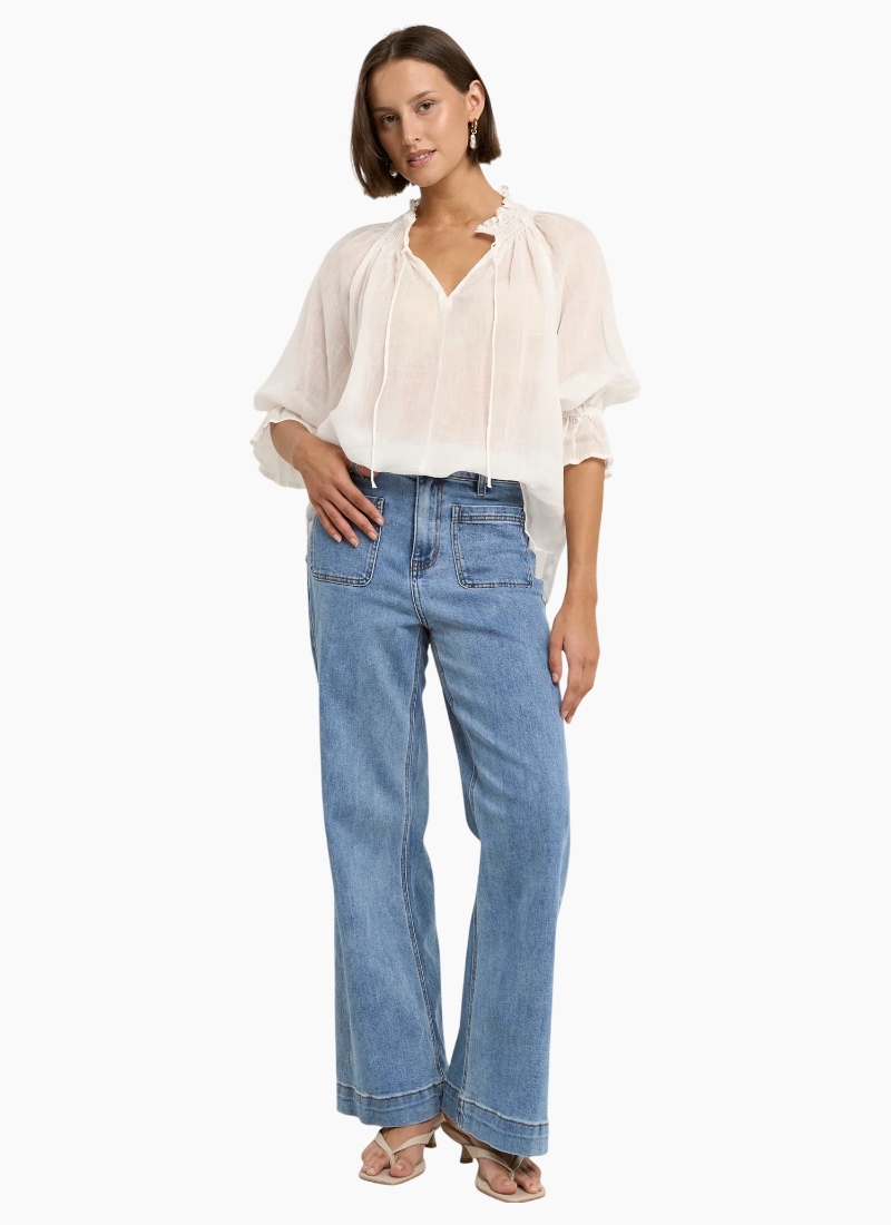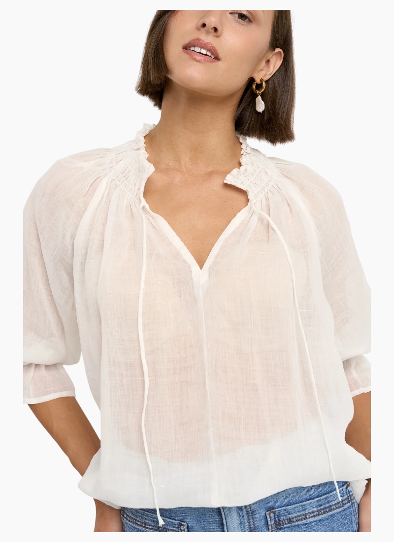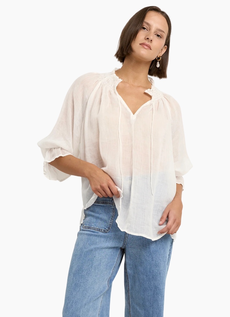 Light and breezy, the Expedition Ivory Top is an effortless staple for any wardrobe. The soft, fabric drapes beautifully, while delicate ruffle cuffs and tie detailing at the neckline add a feminine touch. This top transitions seamlessly from casual days to elevated evenings. Pair it with a mini skirt and sneakers for an easy daytime look or tuck it into tailored pants for a chic, polished finish.
