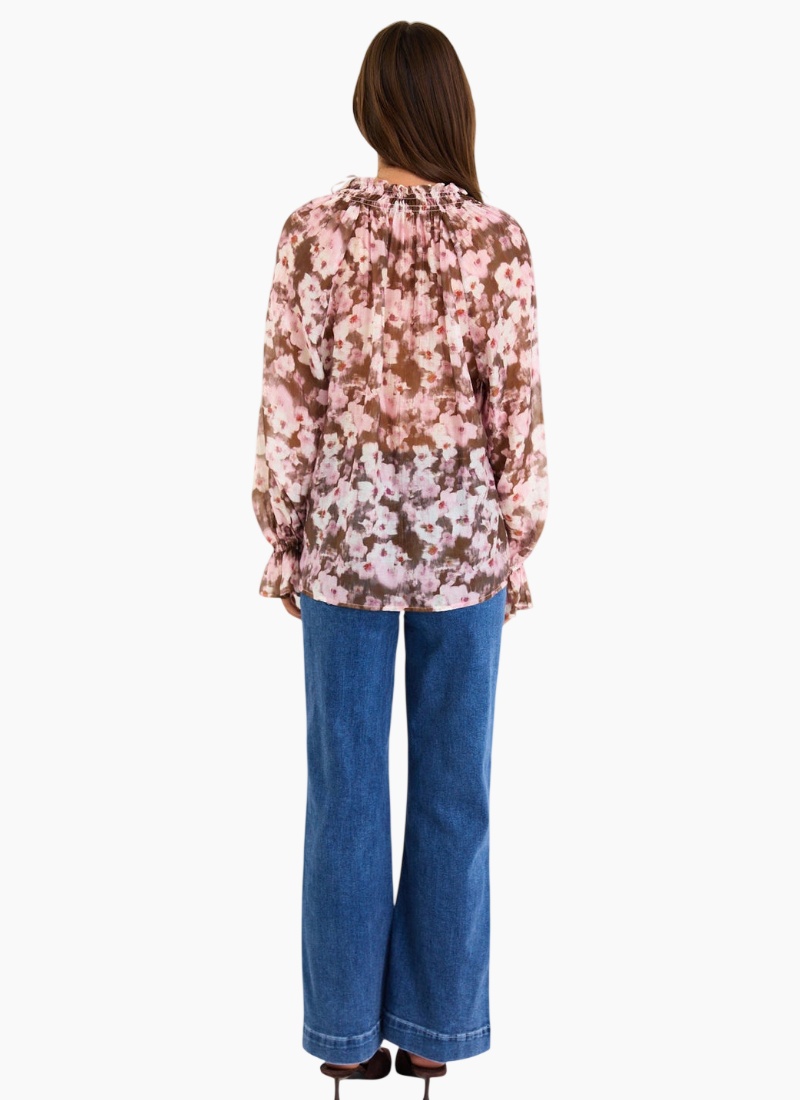 The Odyssey Top brings romantic movement to your wardrobe with its soft, painterly floral print in blush and chocolate tones. The shirred neckline and floaty sleeves create an effortless drape that feels both feminine and modern, while the lightweight fabric gives it a beautiful sway with every step. Easy to style with denim or tailored pieces, it’s an instant way to elevate your everyday looks.