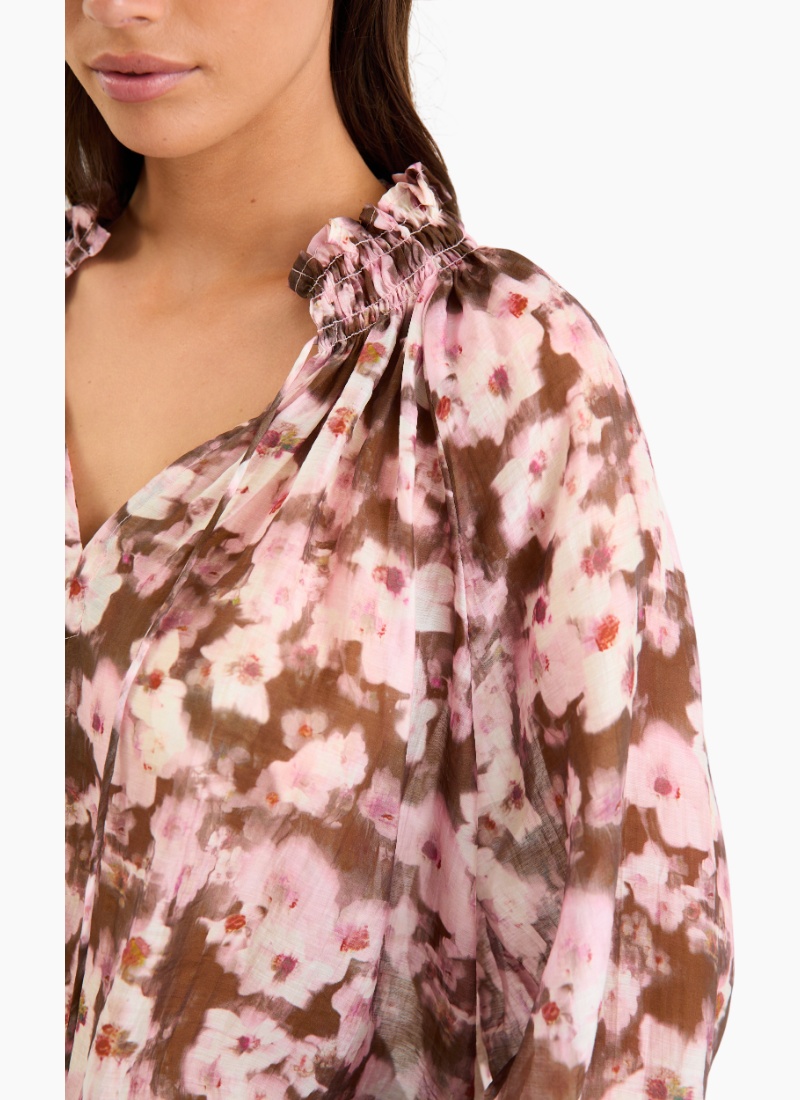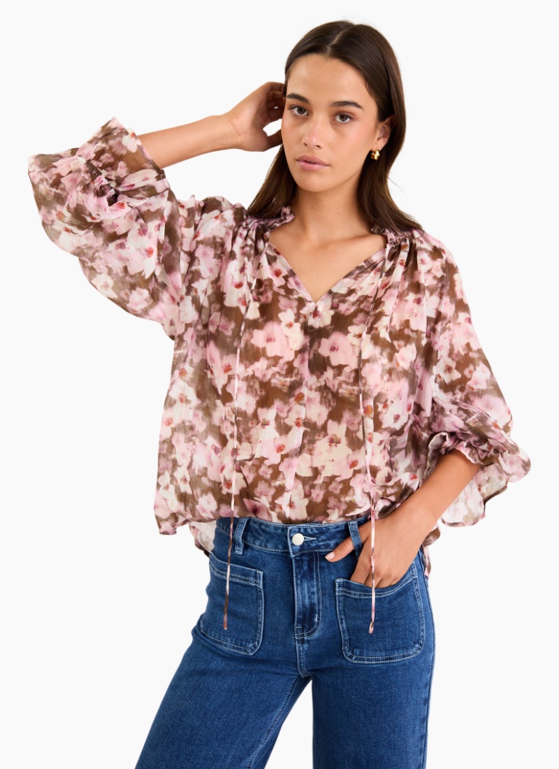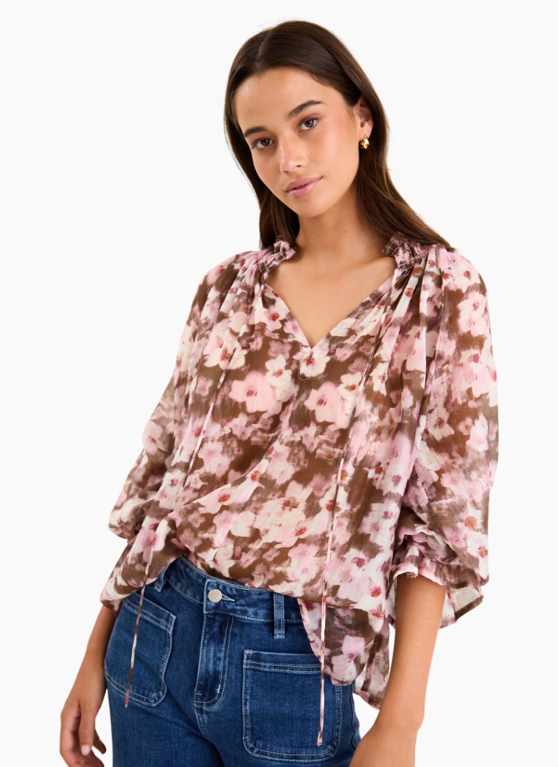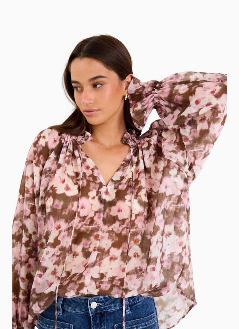 The Odyssey Top brings romantic movement to your wardrobe with its soft, painterly floral print in blush and chocolate tones. The shirred neckline and floaty sleeves create an effortless drape that feels both feminine and modern, while the lightweight fabric gives it a beautiful sway with every step. Easy to style with denim or tailored pieces, it’s an instant way to elevate your everyday looks.