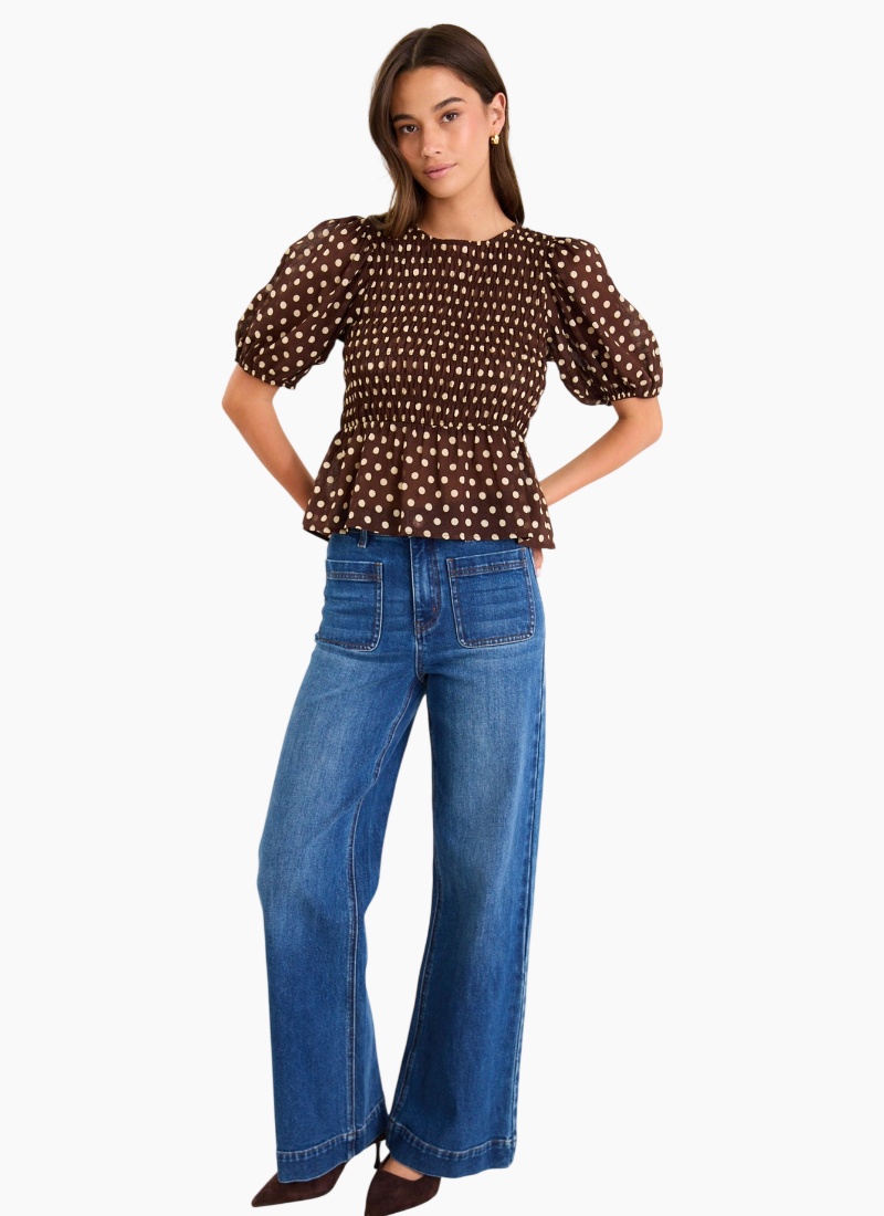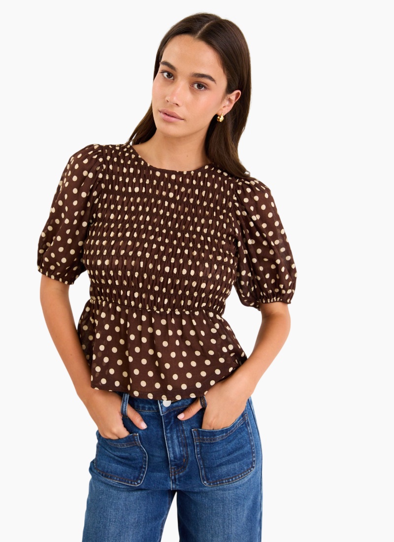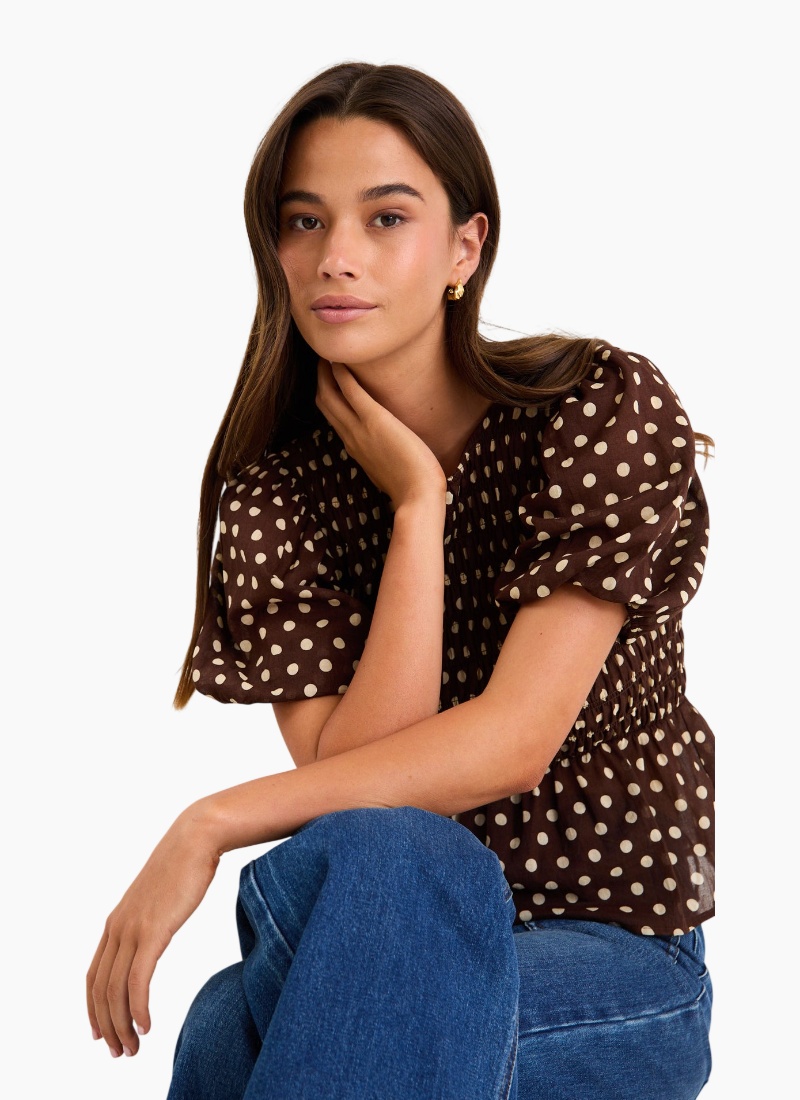 Playful, breathable and easy to wear, the Requite Top brings a fresh spin to classic polka dots. The cotton-linen blend feels light on the skin while the shirred bodice shapes gently through the waist, finished with soft puff sleeves and a flattering peplum hem.