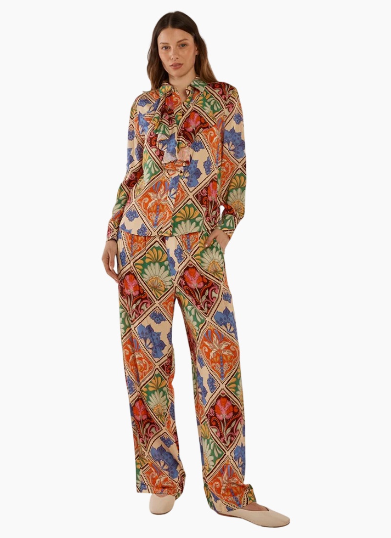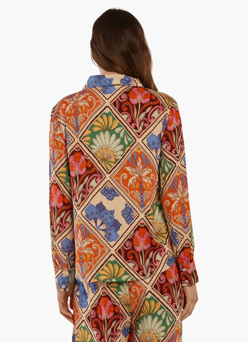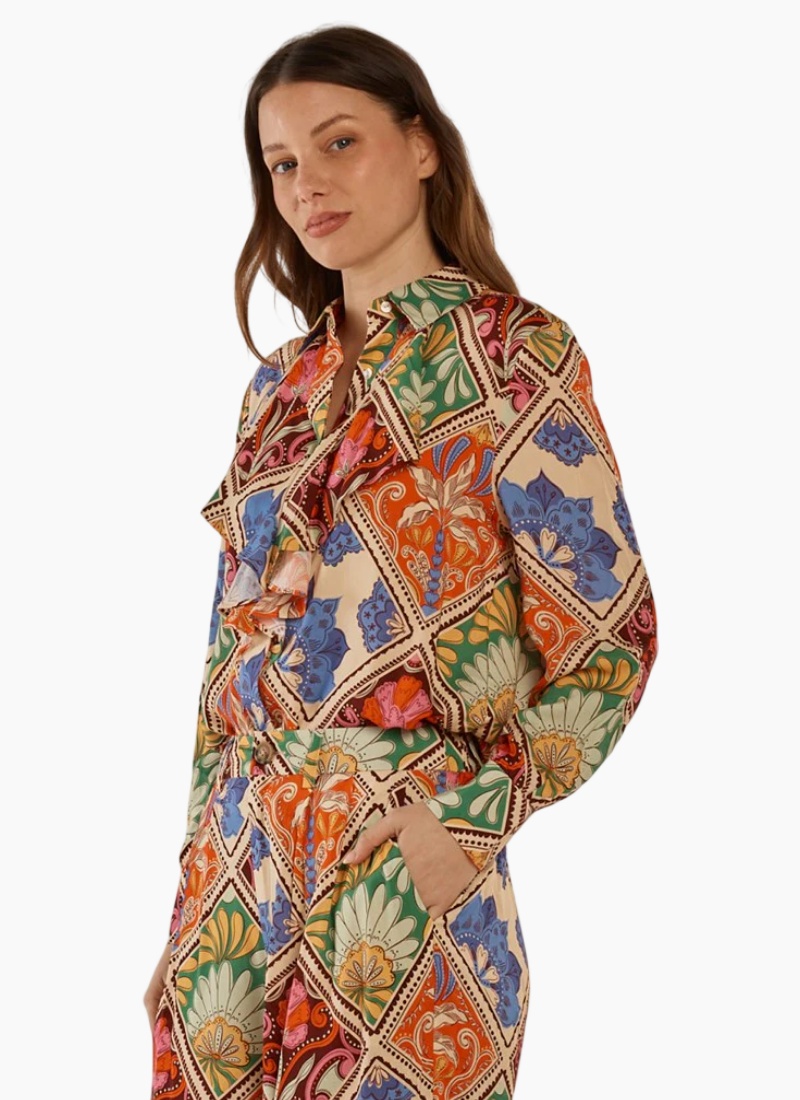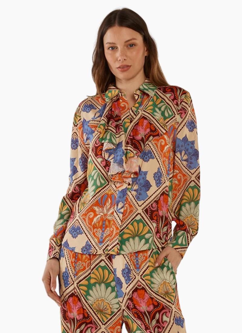 Introducing the Frida Frill Shirt from Betty Basics. This vibrant shirt offers a cream base with a bold multicolour floral-paisley print and a soft, flowing viscose finish.