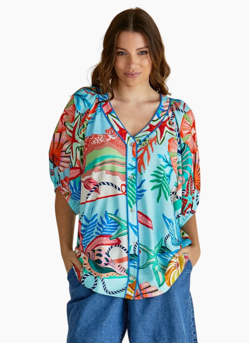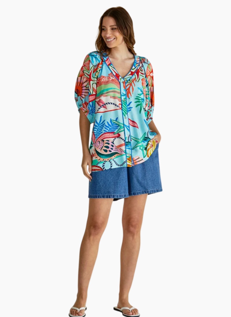 Introducing the Rio Reef Shirt from Betty Basics. This vibrant shirt brings a sun-soaked, reef-inspired print in an aqua palette to your wardrobe for an effortless holiday-ready look.