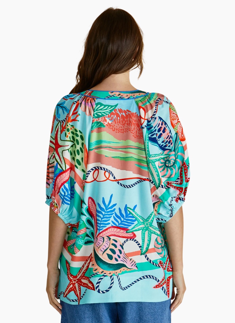 - Bold aqua base with multicoloured reef motifs creates a striking statement top in the Tops category