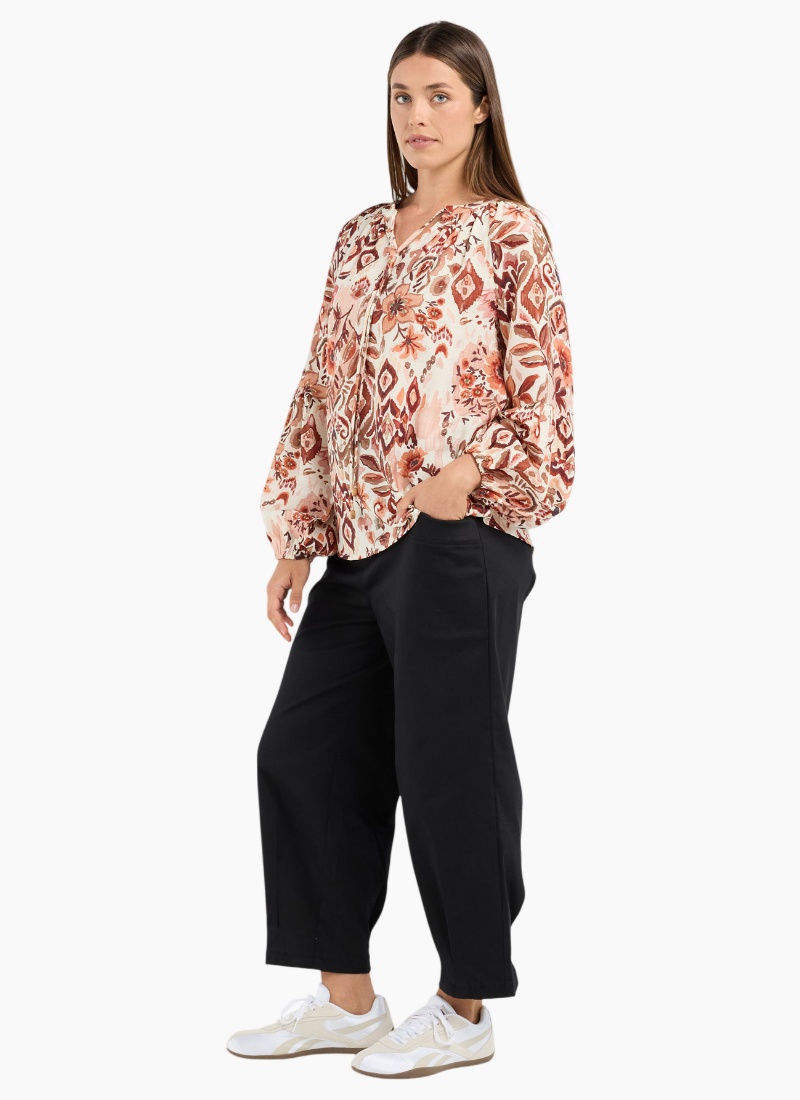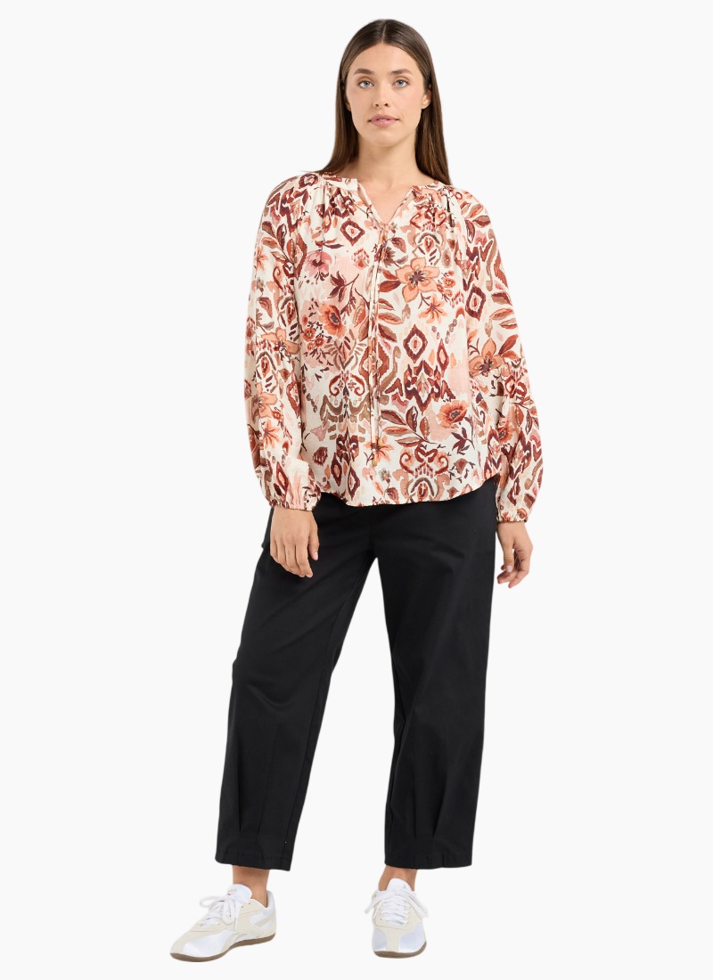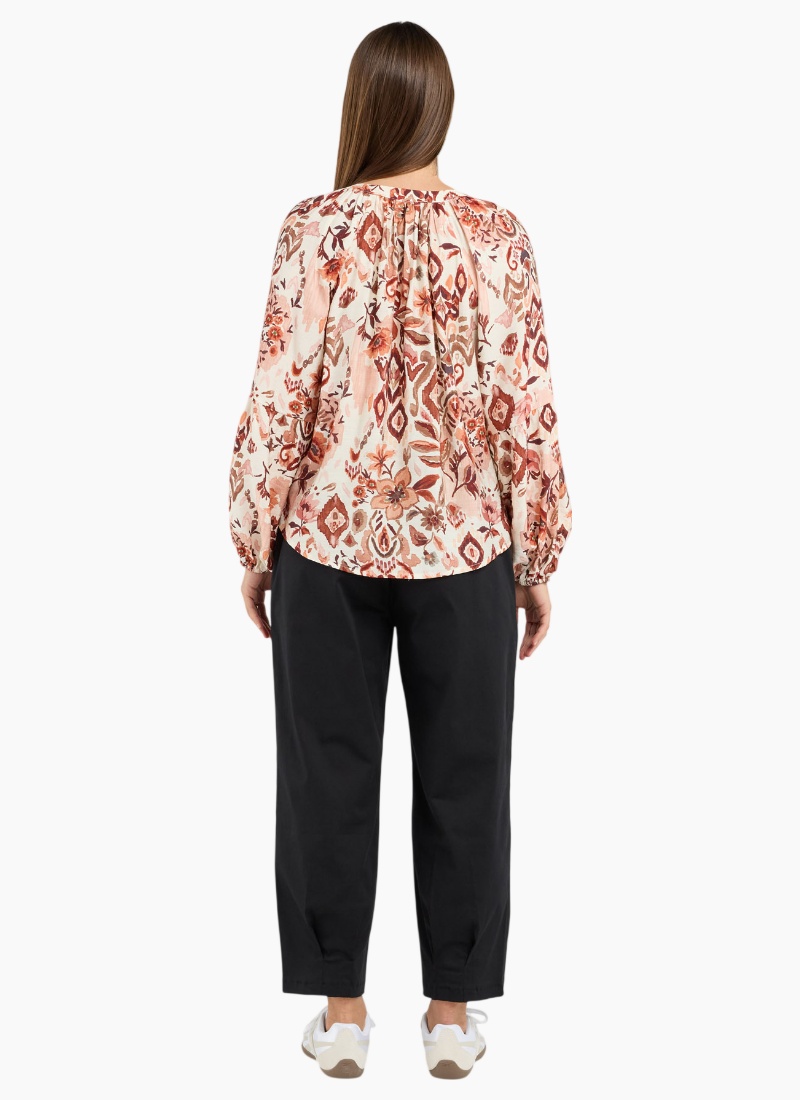Introducing the Monica Gathered Shiraz from Blackstone. This lightweight printed blouse brings a relaxed, sophisticated mood to everyday dressing.