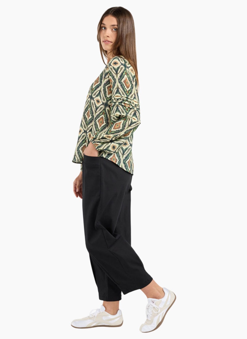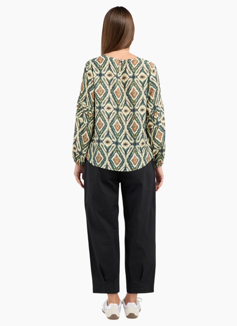 Introducing the Skylar Pintuck Top from Blackstone. A printed green blouse in a lightweight viscose that brings relaxed polish to everyday dressing.