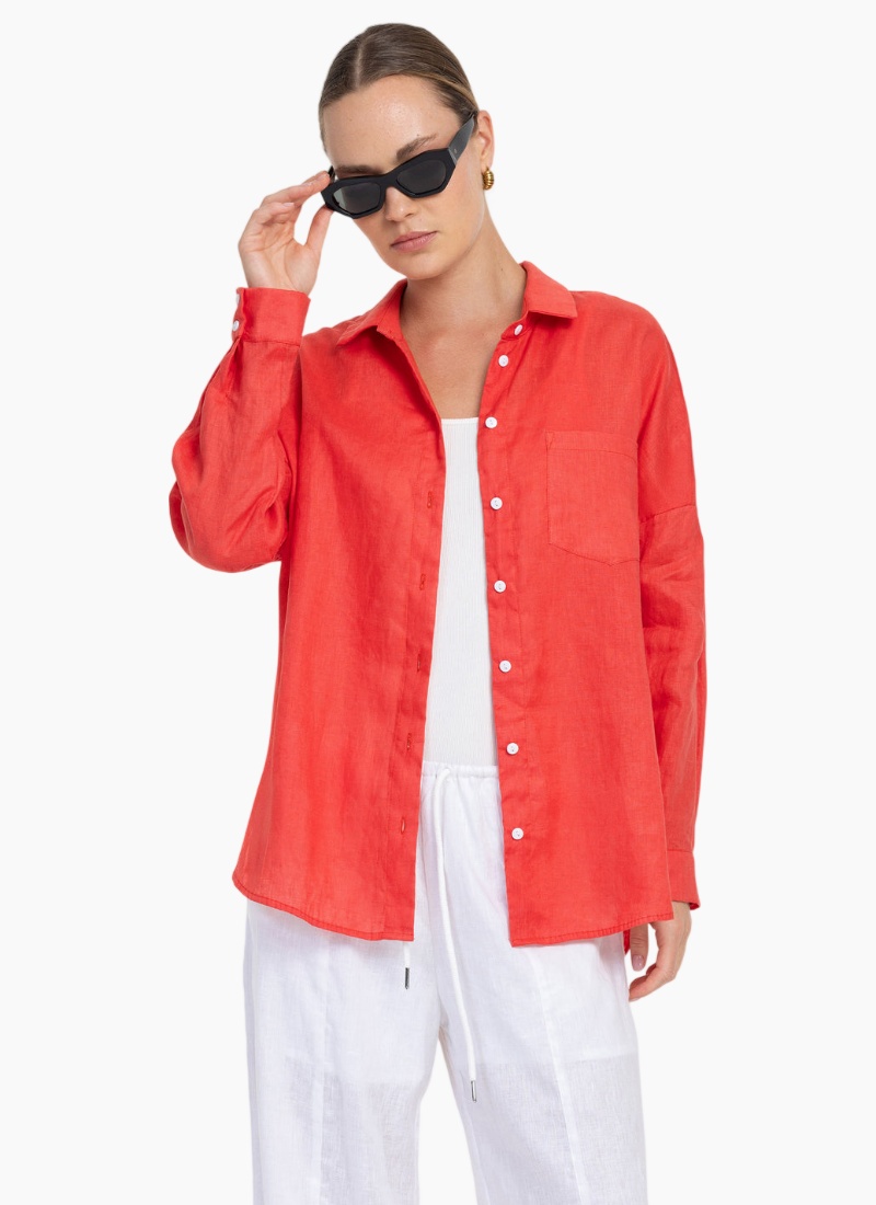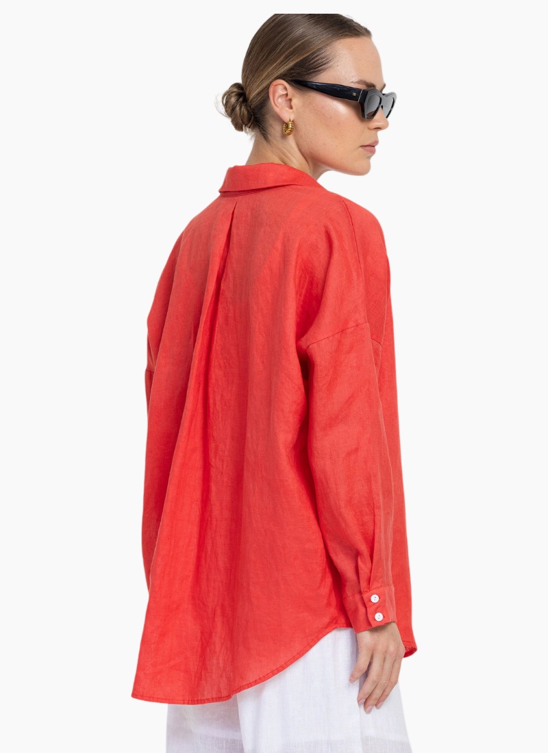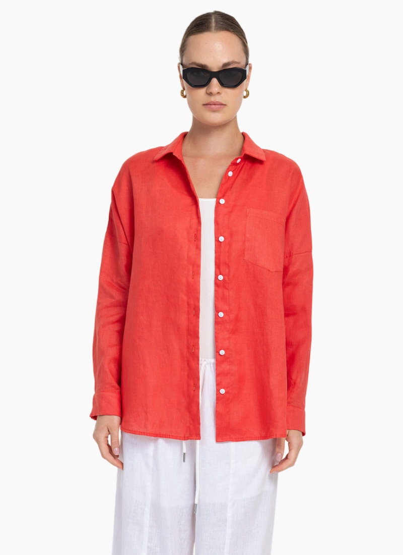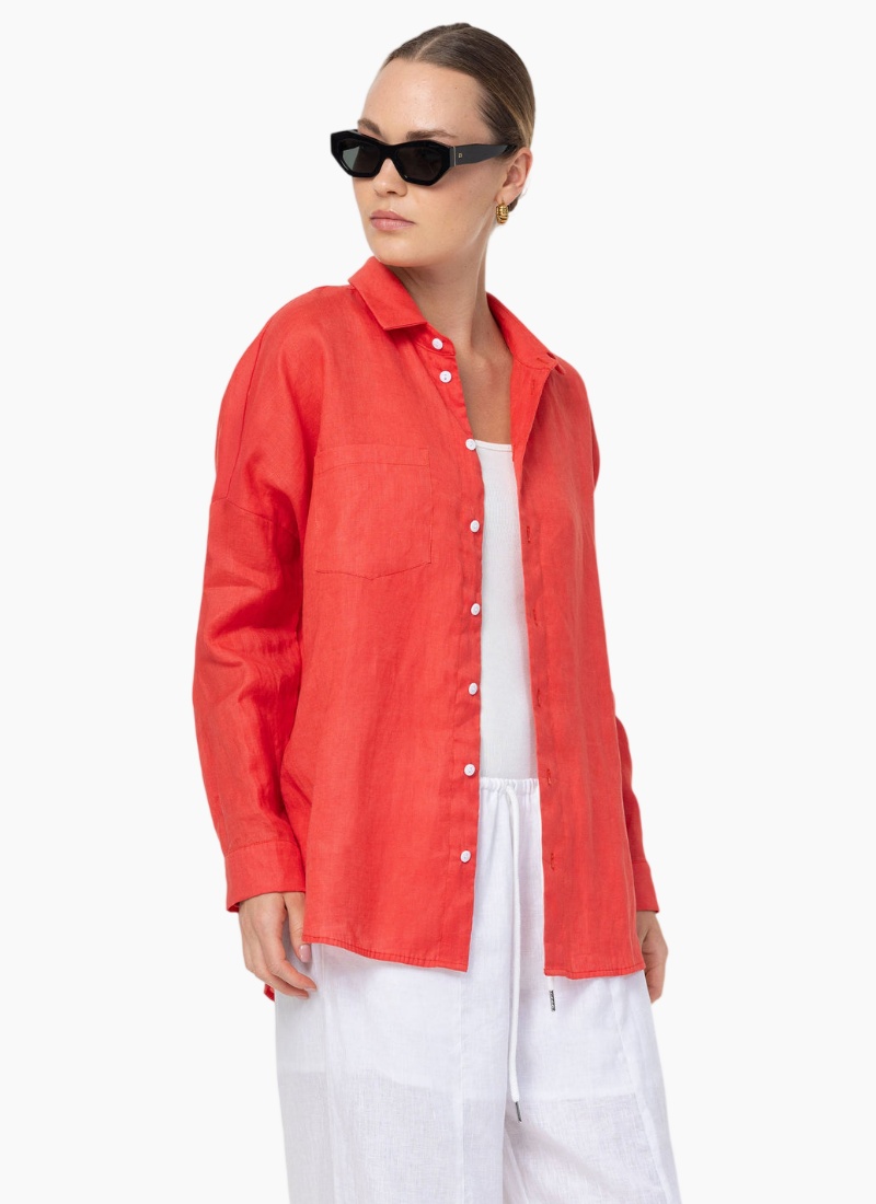 Elevated in its simplicity, the Defiant Shirt introduces a touch of modern polish to a classic linen silhouette. Crafted from premium, lightweight linen, it offers an effortless drape that moves with ease while keeping you cool. The bold red hue adds a refined pop of colour—striking yet wearable—making it the perfect layer for relaxed weekends, coastal escapes, or softly tailored weekday looks. Wear it undone over a tank or buttoned for a cleaner finish; its versatility makes it a true wardrobe essential.Button-through front Tailored collar Chest patch pocket Buttoned cuffs Curved hemline