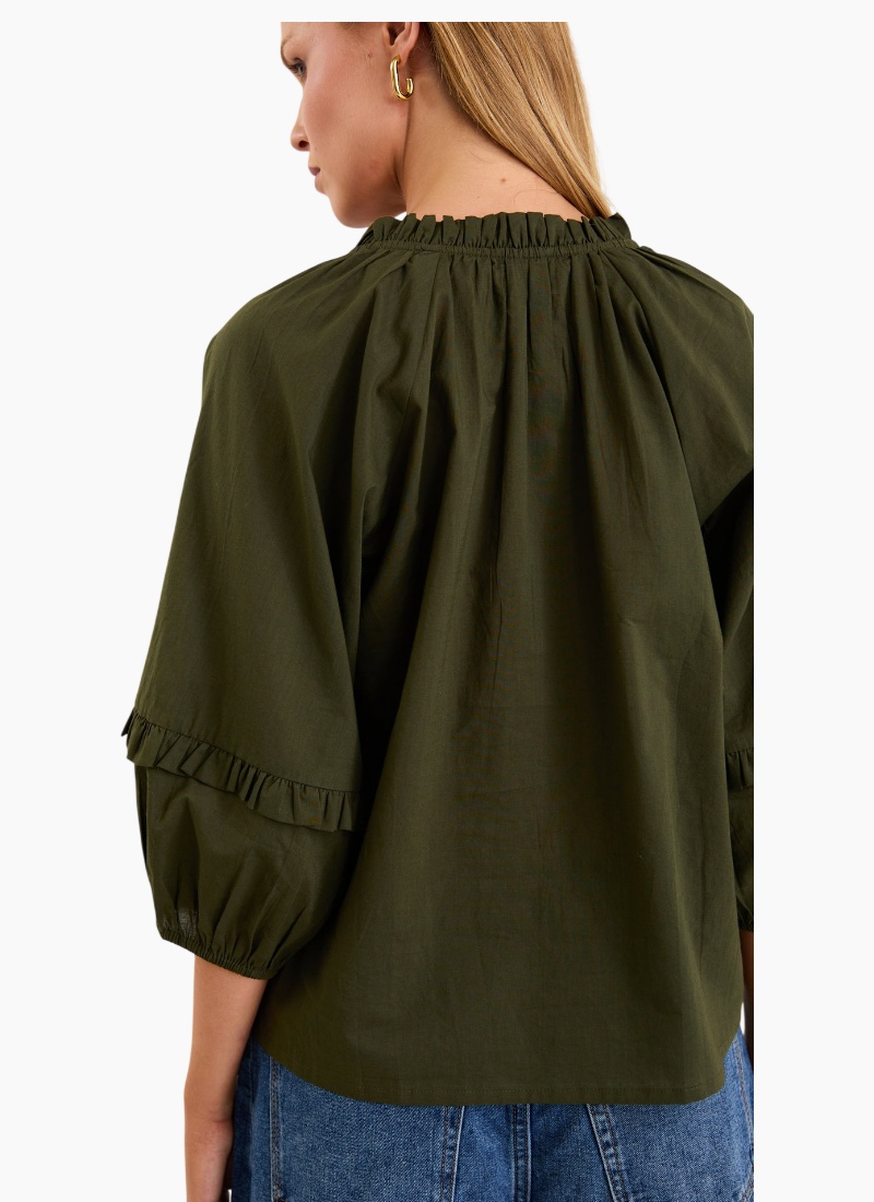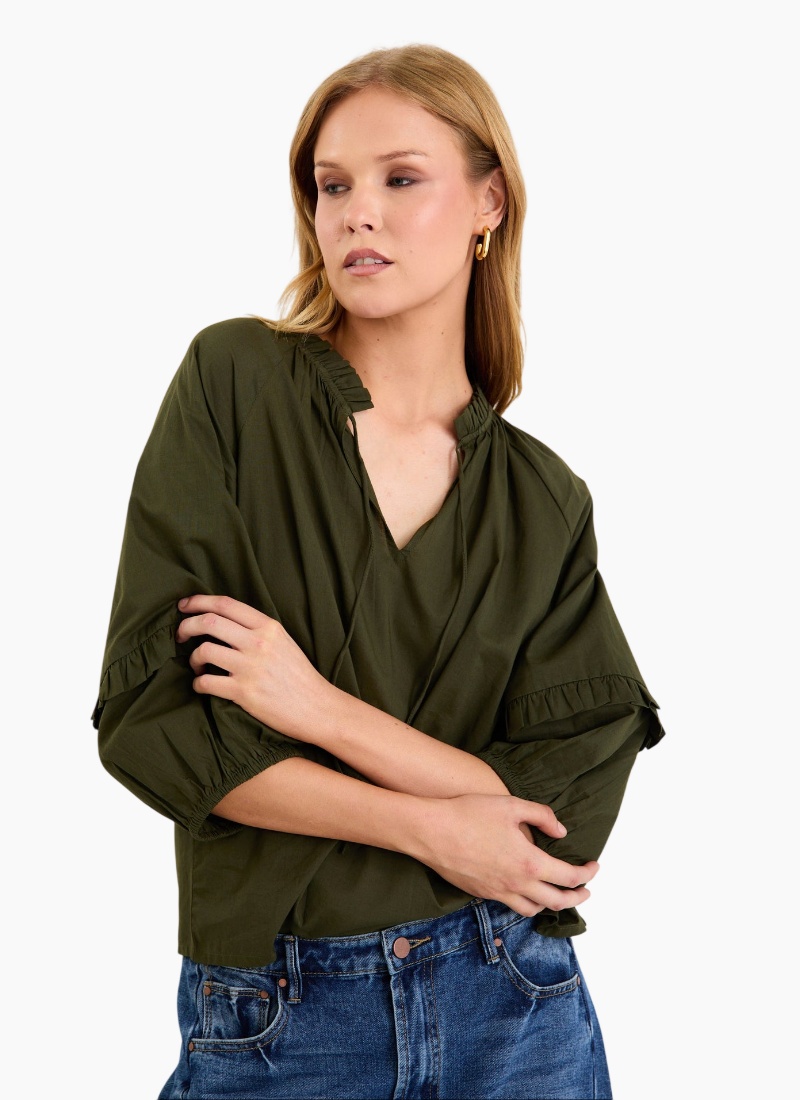 Easy-going with a touch of elegance, the Luminary olive top is made for relaxed yet polished days. Crafted from 100% natural cotton, this lightweight beauty features gentle gathering and subtle ruffle details that add texture without fuss. The soft silhouette and plain design make it effortlessly versatile ideal for cross-seasonal wear and high-low dressing with denim or soft tailoring.