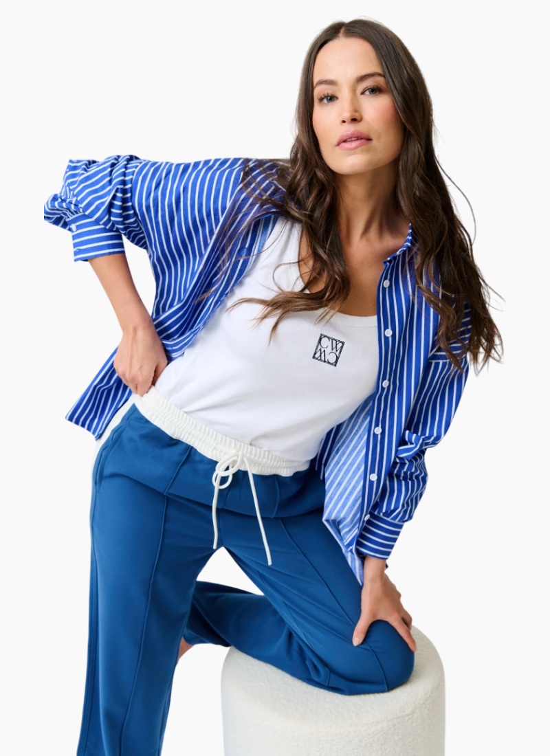 description, Oversized fit, button front shirtLongline, curved hemline Full length sleeve with button cuff Fine striped pattern in cobalt and white stripe 100% soft cotton poplin fabric Sameika is 169cm and wears a size small