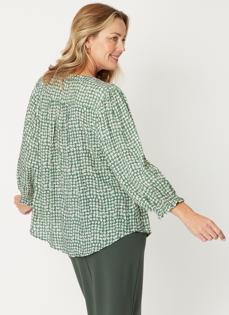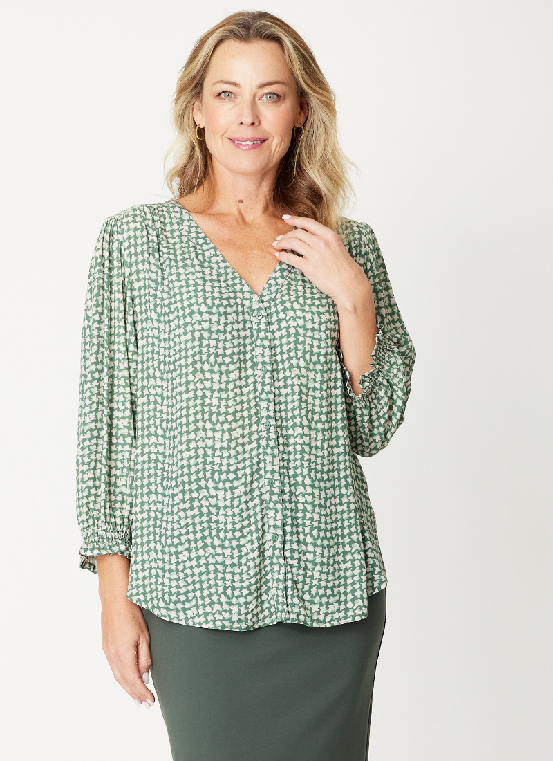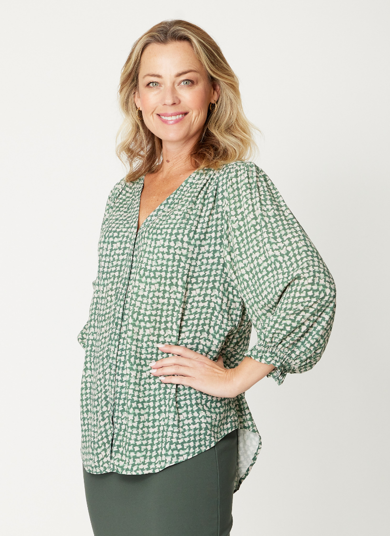 Introducing the Gypsy print top from Cordelia Street. This sage green blouse brings a fresh, feminine print to your wardrobe with effortless drape and movement.