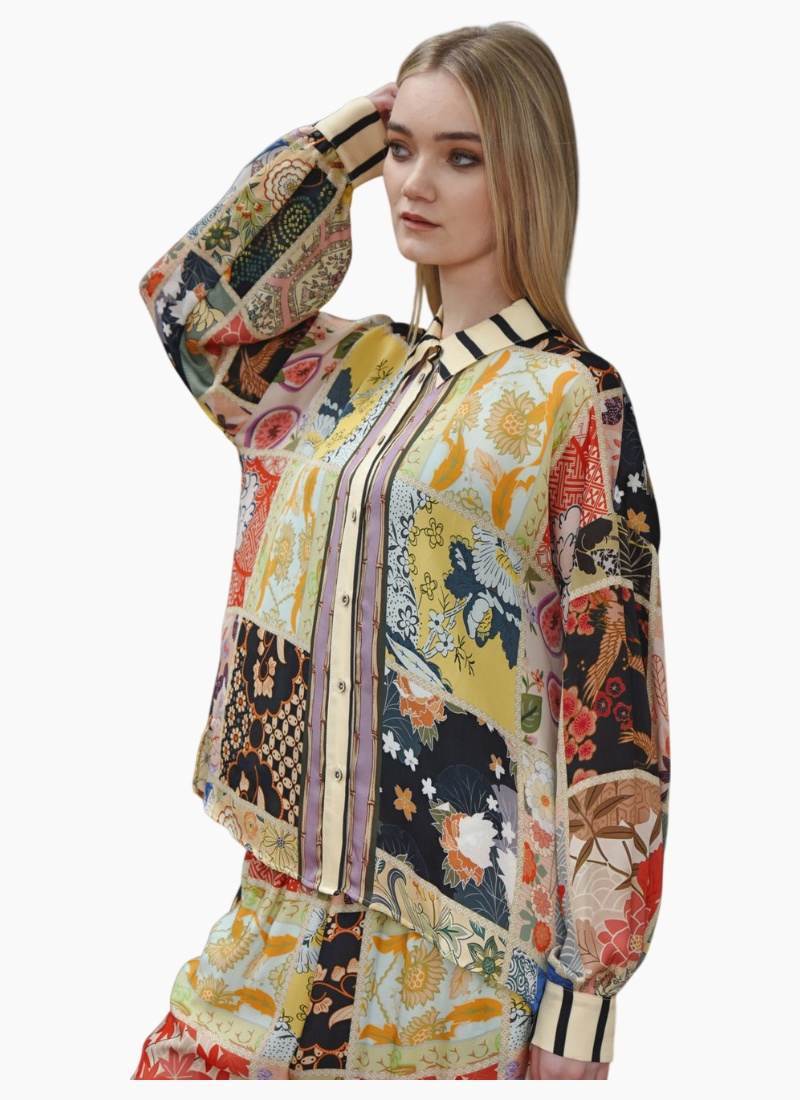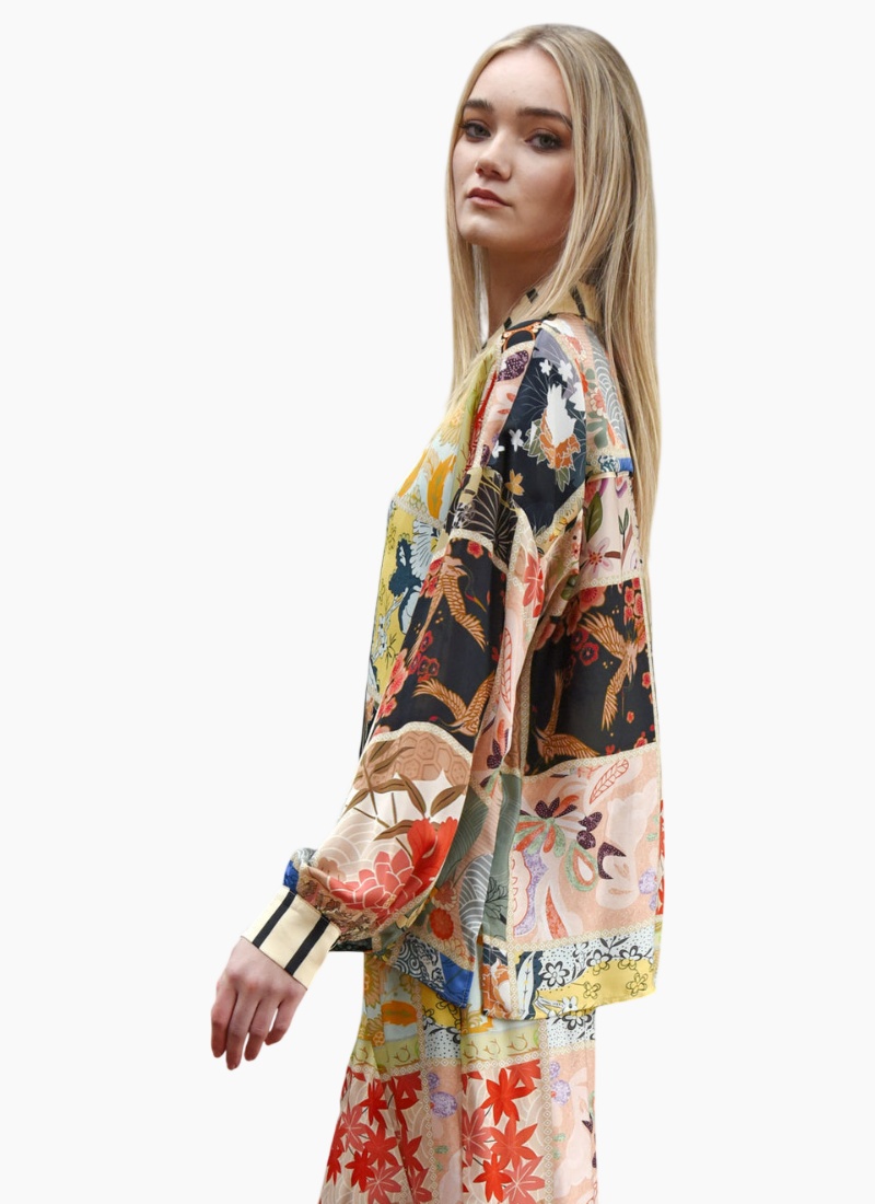 Breezy elegance defines the ‘Under the Sun’ Shirt, crafted in our 'In the Square Tonight' viscose satin. A button-through front and classic collar offer timeless structure, while drop shoulders and blouson sleeves bring relaxed, sculptural volume. Finished with a fixed cuff and button fastening, it’s a versatile piece that pairs effortlessly with skirts, pants, or layered looks.• Button through front • Classic collar • Drop shoulder • Blouson sleeve • Fixed cuff with button fastening • Print placement may differ