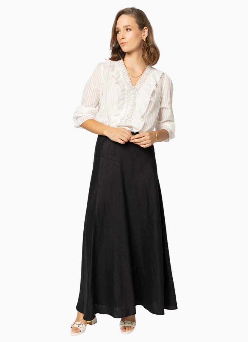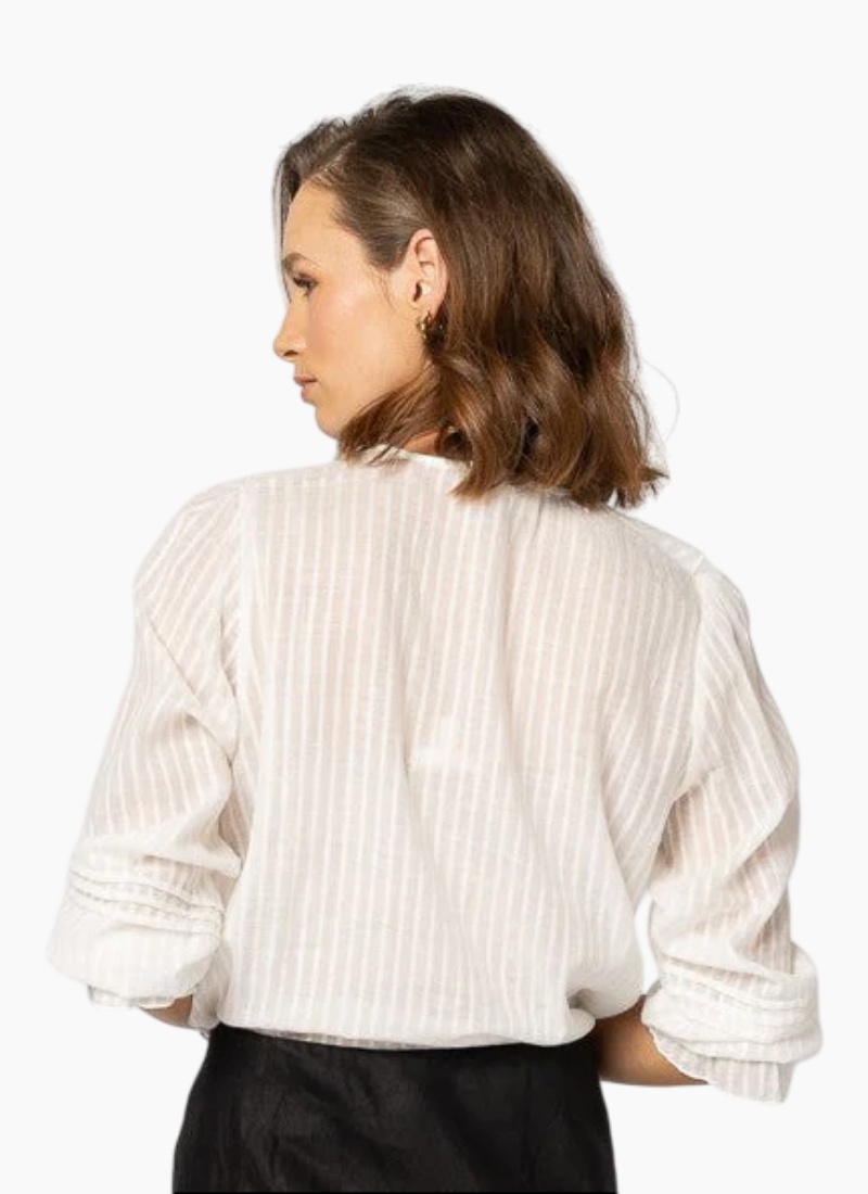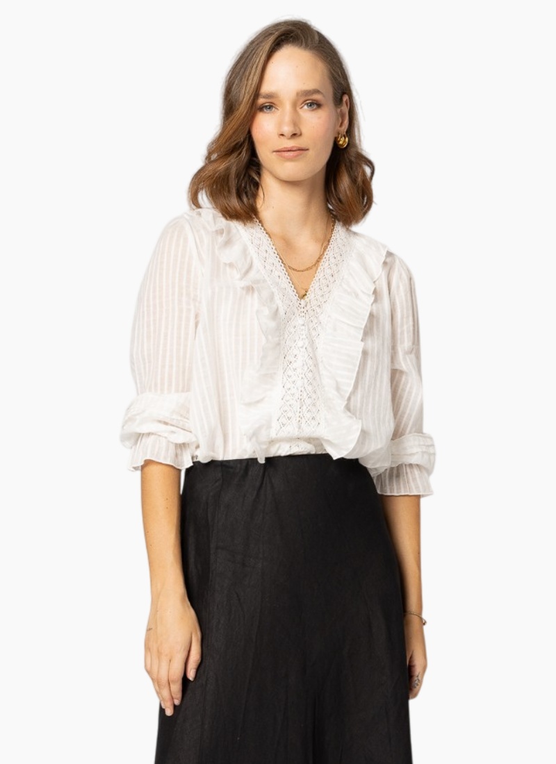 Amelia Blouse, crafted from 100% cotton for ultimate comfort and breathability. This elegant blouse features a natural stripe design and long sleeves adorned with elasticized frill cuffs. The flattering V-neckline is complemented by a delicate lace and ruffle panel that gracefully runs down the front, accentuated by a charming faux button detail. Perfect for both casual and professional settings, the Amelia Blouse is a versatile addition to any wardrobe.Composition: 100% Cotton FIT: True to size for a relaxed fit. Take your usual size. If you’d prefer it less relaxed you could size down. 100% COTTON V NECK RUFFLE DETAILED BUTTON FRONT BLOUSE