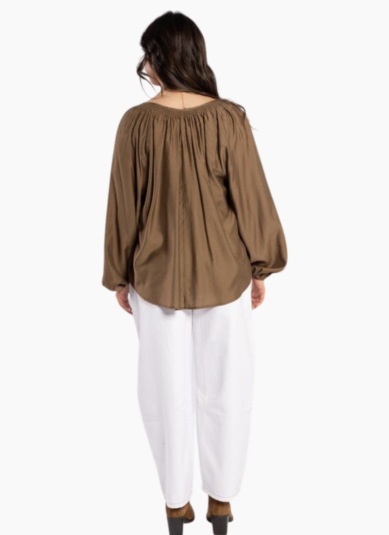 Elegant coffee-colored relaxed-fit blouse featuring intricate shirring detail around the neckline, a v-neck with tie accents, elastic cuffs, and a curved hemline. Crafted from soft Tencel polyester fabric, this versatile blouse is ideal for both dressing up and down, pairing seamlessly with a variety of drama pants, skirts, or denim.
