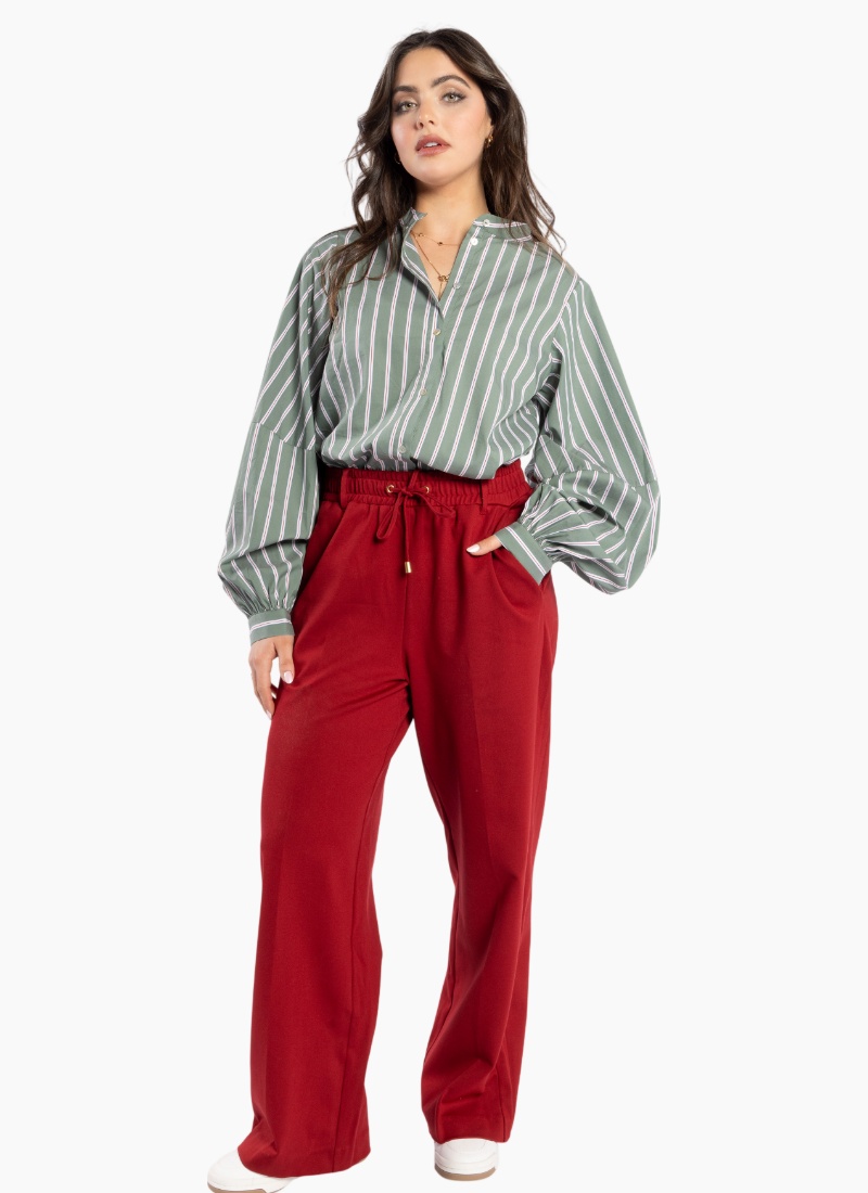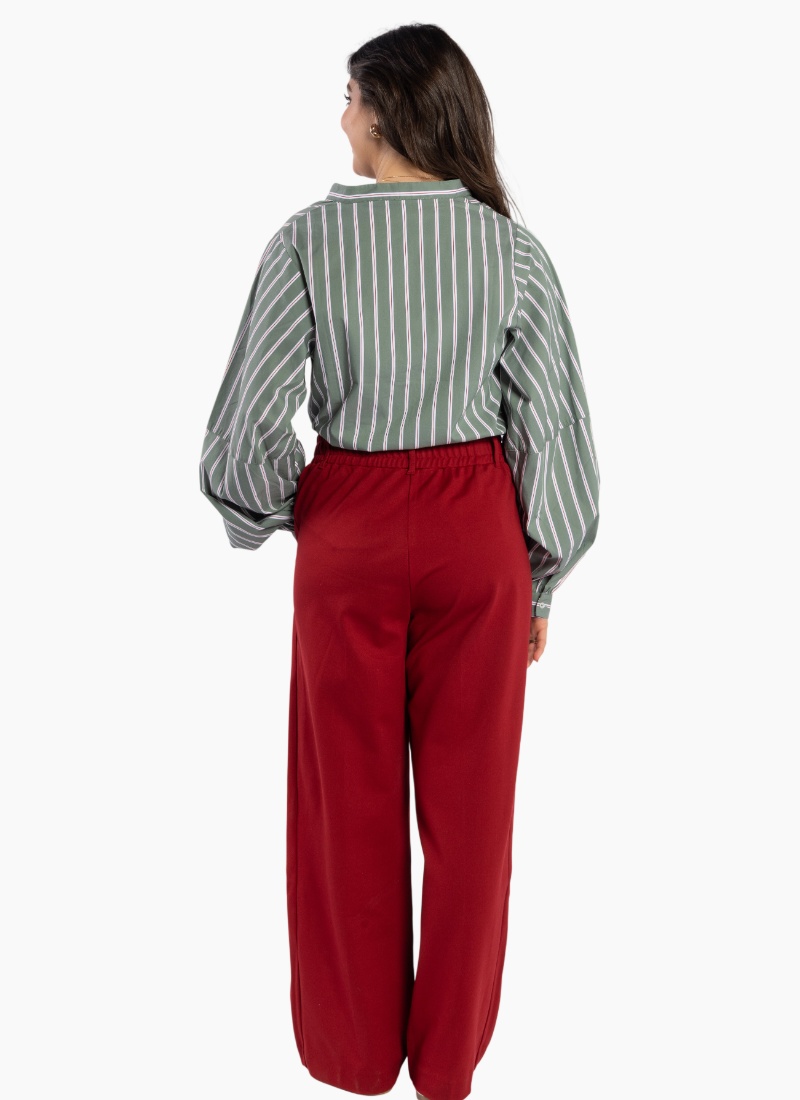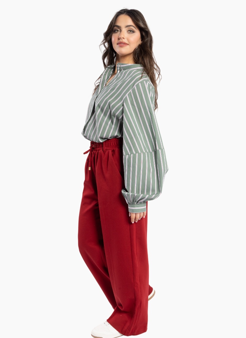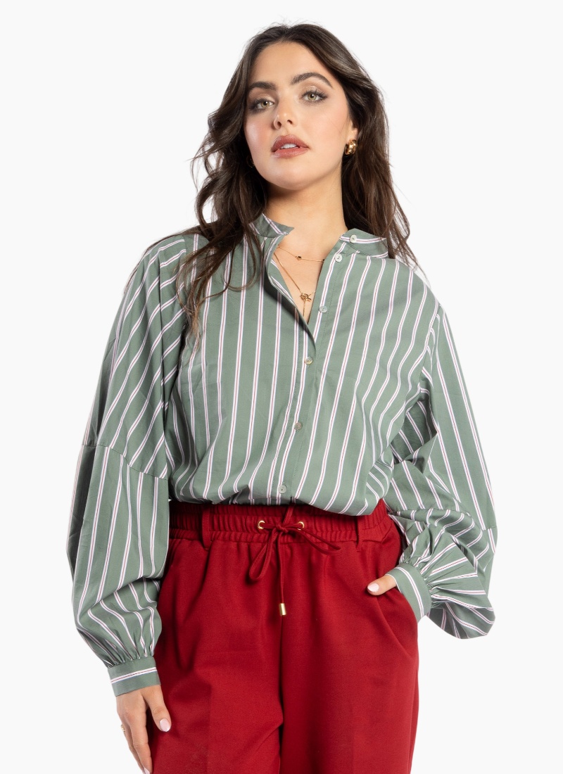 The exquisite Fray Shirt, featuring a sophisticated Chinese collar, a stylish curved hemline, a button front, and oversized drop shoulder sleeves with button cuffs. The shirt base is Green with a white and burgundy stripe adding a touch of elegance to any outfit. Pair this stunning piece with your favourite bottoms for a chic and versatile look. Composition: 71% Cotton 25% Nylon 4% Spandex