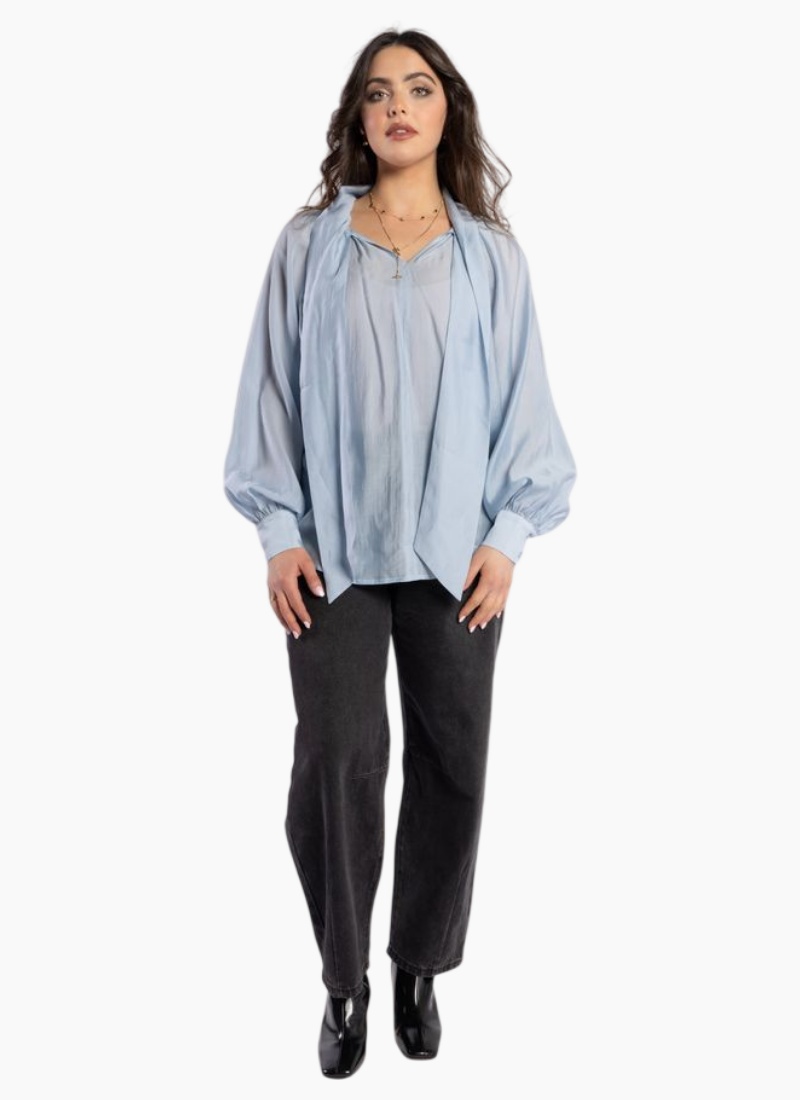 - Designed as a Shirts & Blouses style with a relaxed silhouette and elegant tie-neck scarf detail