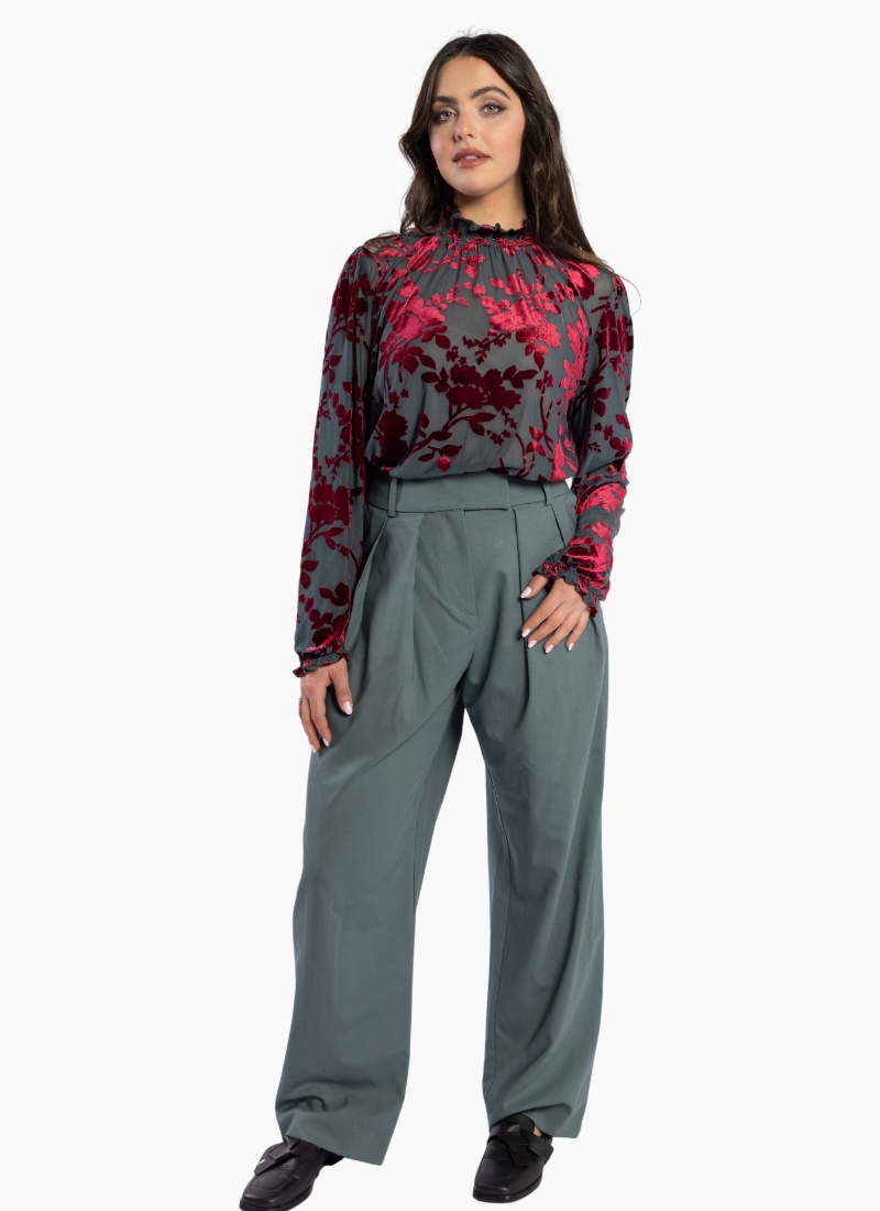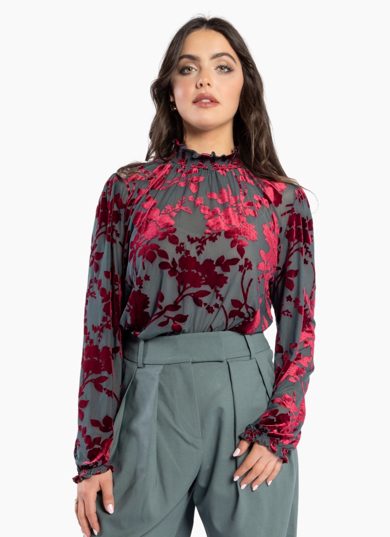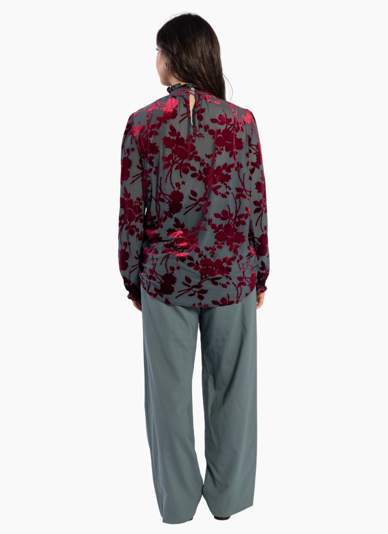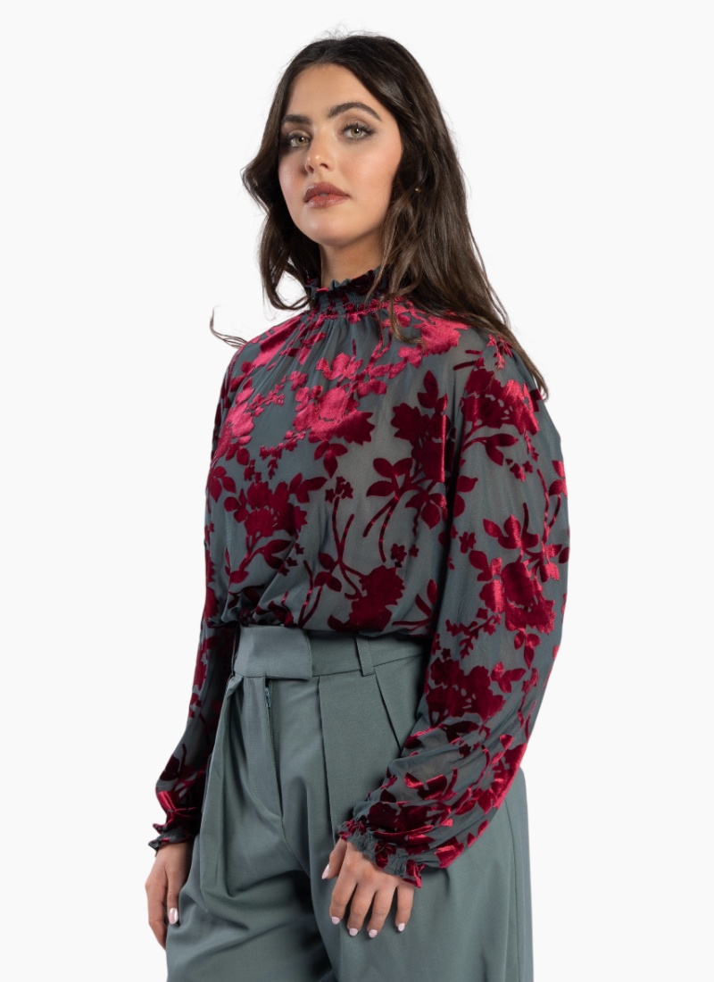 The highly sought-after Heidi Blouse is back, this time in a stunning velvet fabric, the base is a steel colour and the velvet flowers are a rich burgundy. This blouse features a charming lace detail on the sleeve and a double button back neck with elasticated neck detail, making it perfect for any occasion. Whether you're heading to the office or out for a night on the town, this versatile piece can easily transition from day to night. Composition: 65% Viscose 35% Polyester