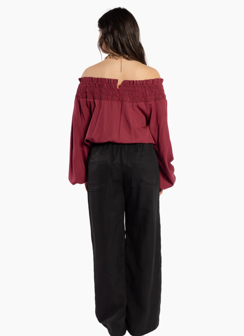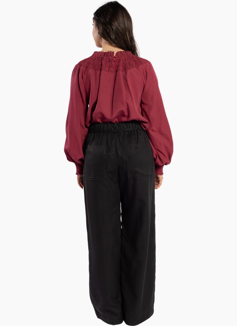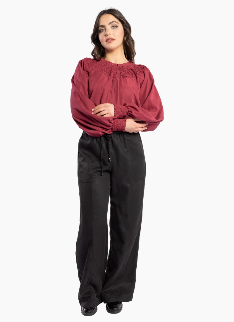 The Karin Blouse is back in a Stunning Shiraz colour this features an elastic shirred yoke neckline which can also be worn off the shoulder and long sleeves with elastic cuffs. This versatile style can easily be dressed up with your favourite Drama Denim or Pants. Composition: 90% Tencel 10% Linen