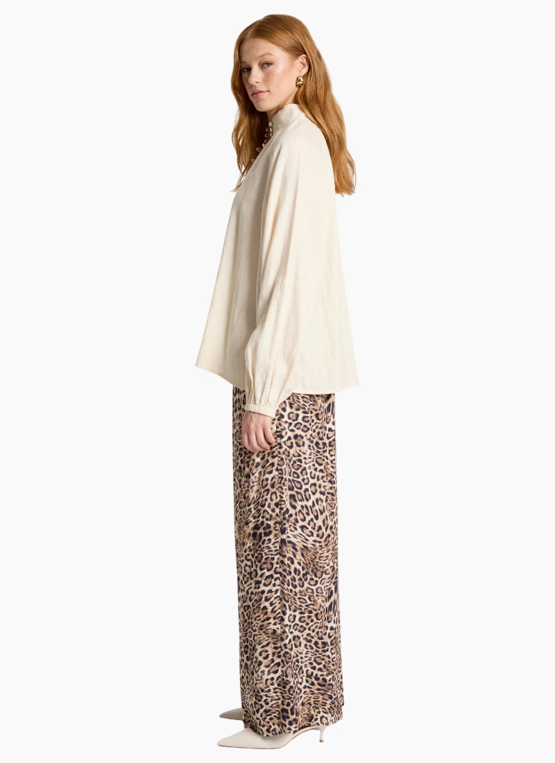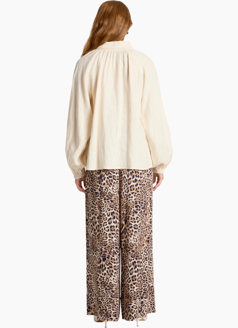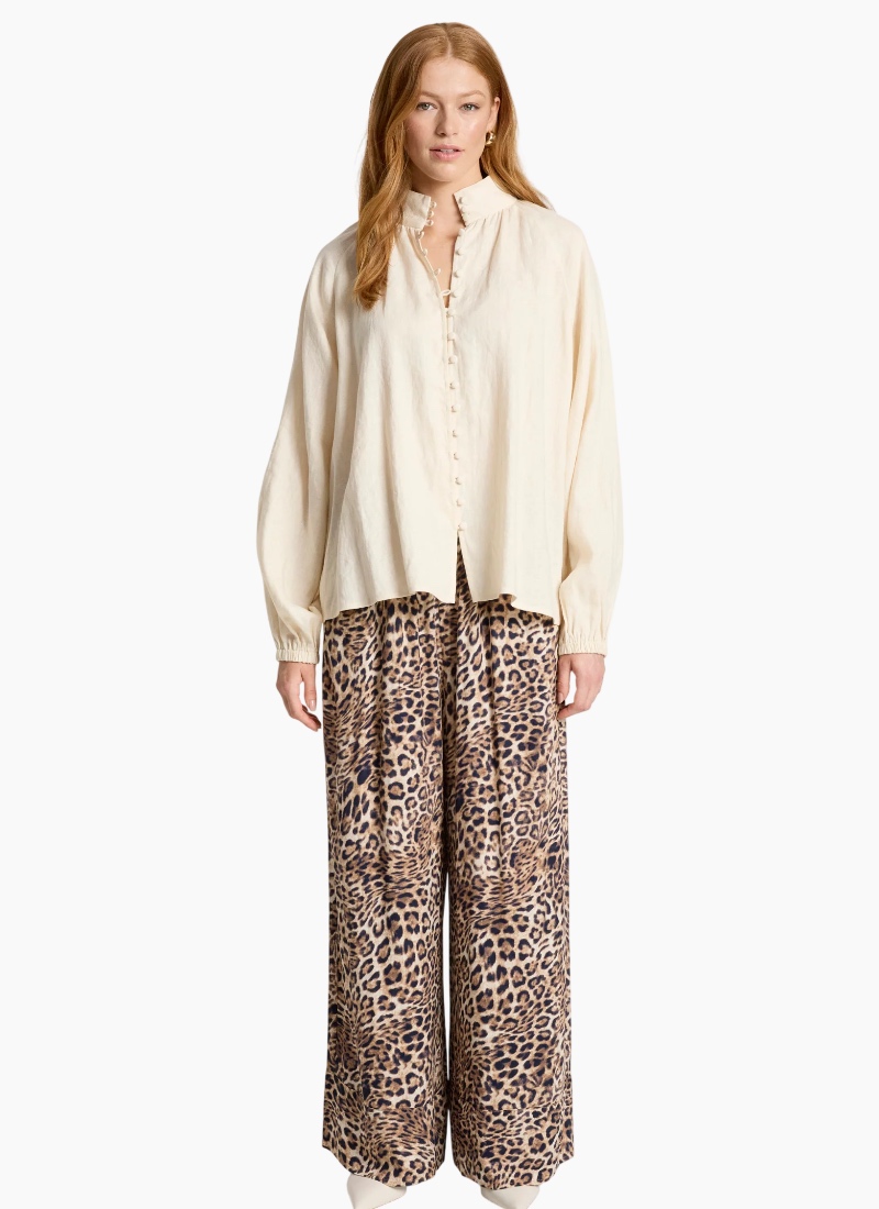 A refined shirt crafted from soft-washed 100% linen, offering a modern take on an everyday silhouette. Designed with a high neck collar, delicate rouleau loop closures with self-covered buttons, and elasticated shirred cuffs that create a soft blouson sleeve. Clean, minimal and versatile, this timeless style pairs effortlessly with wide-leg pants or denim for an elevated everyday look. Design Features High neck collar Rouleau loop closures with self-covered buttons Elasticated shirred cuffs with subtle blouson sleeve Lightweight, breathable linen Soft-washed for a relaxed feel