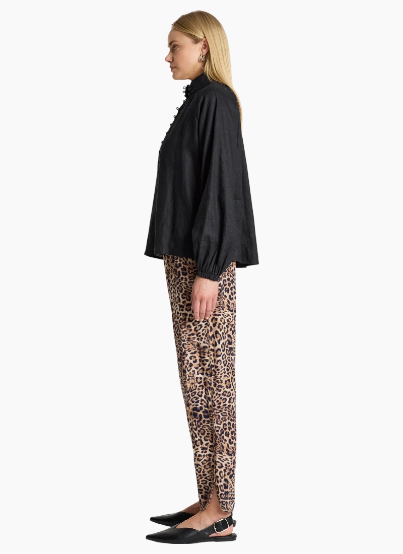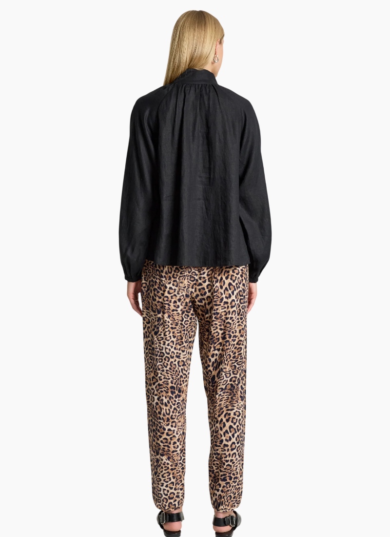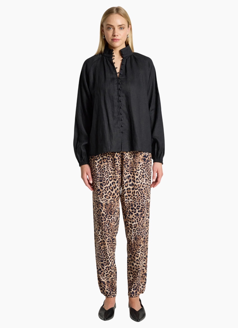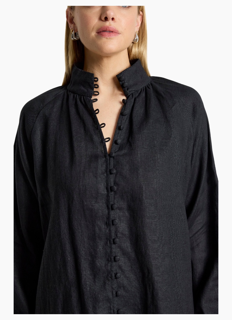 A refined shirt crafted from soft-washed 100% linen, offering a modern take on an everyday silhouette. Designed with a high neck collar, delicate rouleau loop closures with self-covered buttons, and elasticated shirred cuffs that create a soft blouson sleeve. Clean, minimal and versatile, this timeless style pairs effortlessly with wide-leg pants or denim for an elevated everyday look. Design Features High neck collar Rouleau loop closures with self-covered buttons Elasticated shirred cuffs with subtle blouson sleeve Lightweight, breathable linen Soft-washed for a relaxed feel